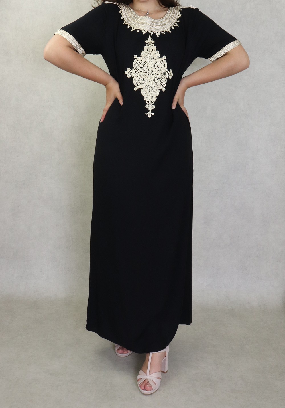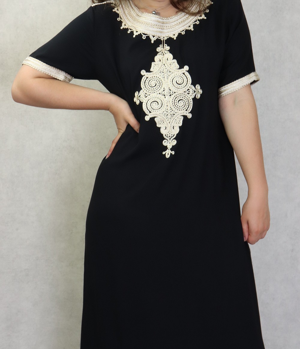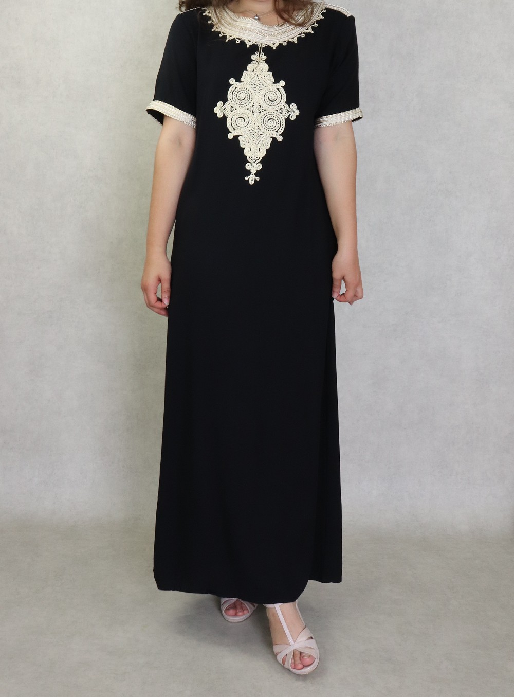 Une robe longue très confortable, manches courtes. Coupe droite avec nombreuses broderies. Matière fluide et agréable de type coton idéale pour la maison et la chaleur de l'été.