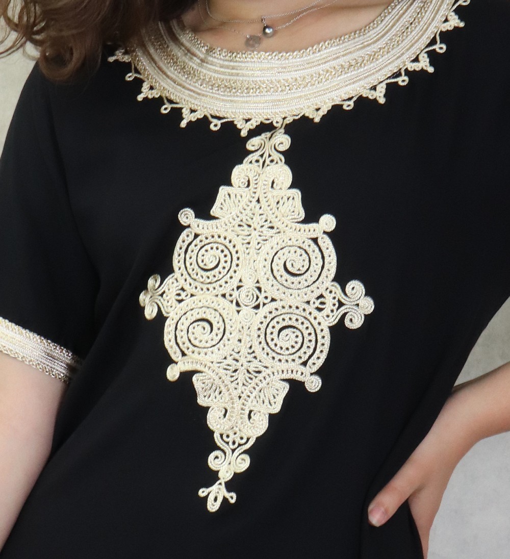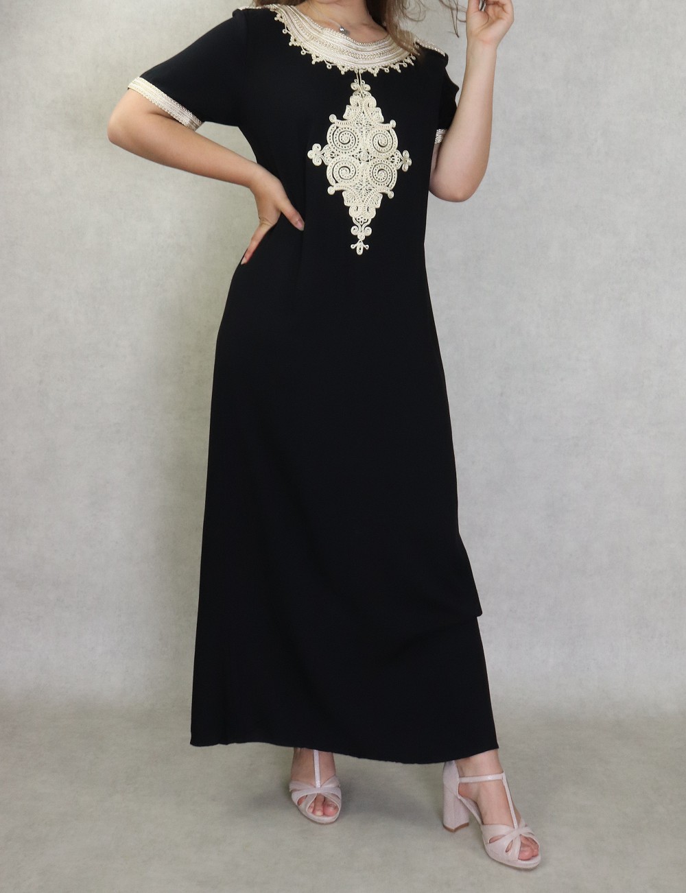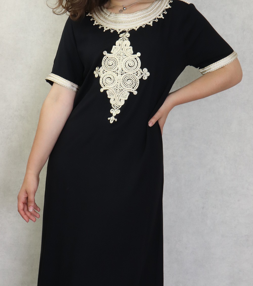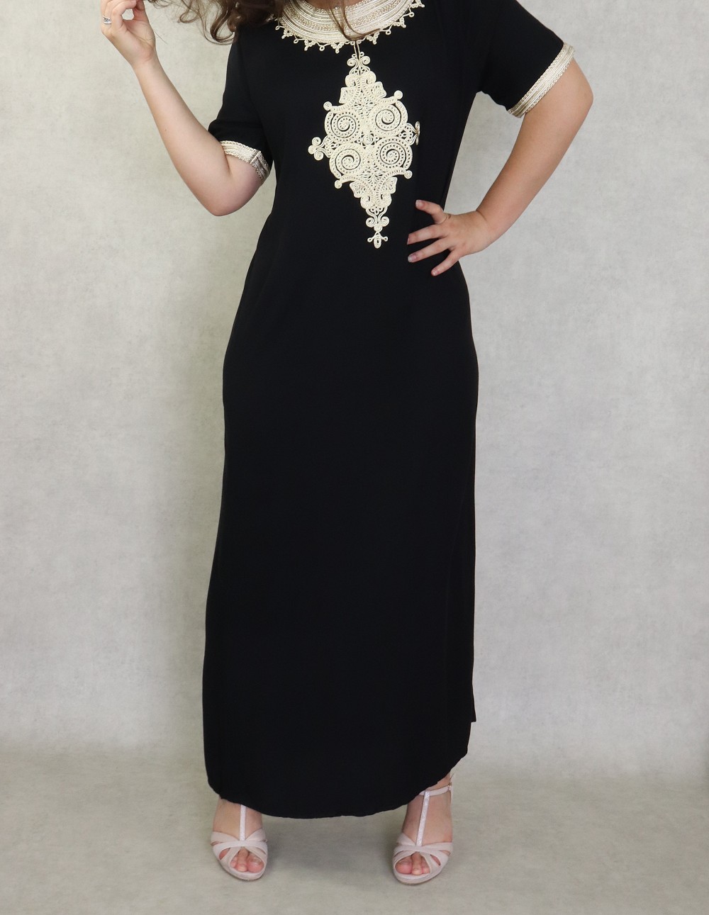Une robe longue très confortable, manches courtes. Coupe droite avec nombreuses broderies. Matière fluide et agréable de type coton idéale pour la maison et la chaleur de l'été.