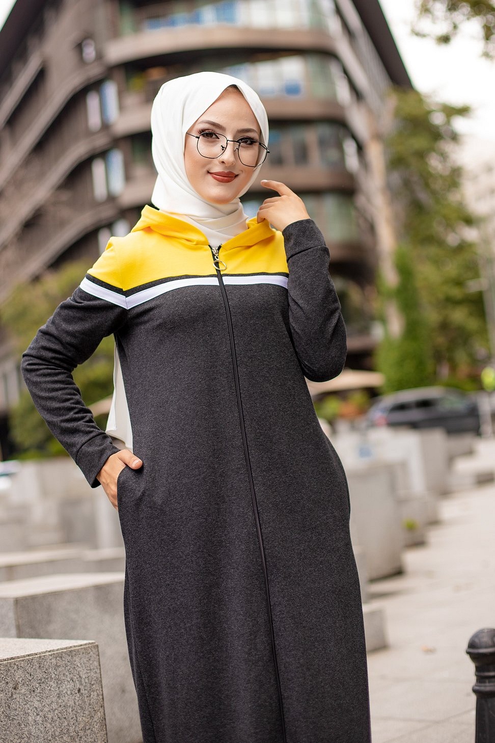 Robe zippée décontractée et sport pour femme (Vêtement Moderne Hijab) - Couleur anthracite et moutarde Vetement & Accessoire