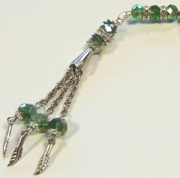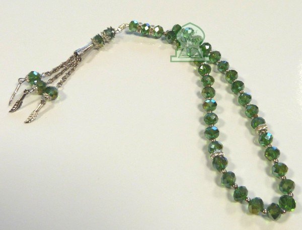 Sabha Chapelet 33 perles cristal vert avec decorations metalliques argentees