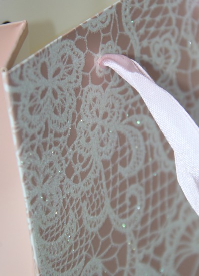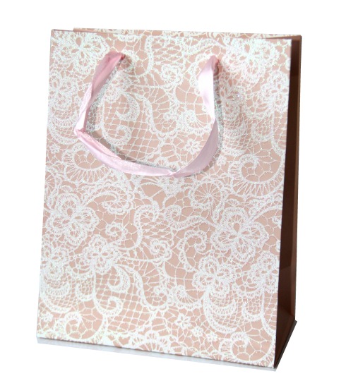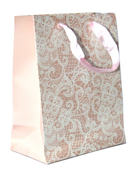 Sac Cadeau en papier rose clair décoré d'arabesques blancs avec paillettes (Dimensions 18 x 23 x 10 cm).