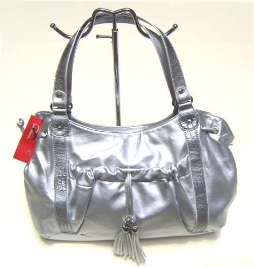 Sac à main argenté en simili cuir, il se porte sur l'épaule ou à la main. Il est muni d'une poche zippée au dos et d'autre autre au devant qui se referme avec un bouton pression et ornée d'un pompon. Il se ferme en fermeture éclair pour plus de sécurité.