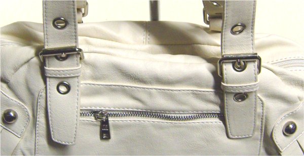 Sac à main beige léger en simili cuir. Il se porte sur l'épaule et se ferme en fermeture éclair. Il est muni d'une poche zippée au devant.