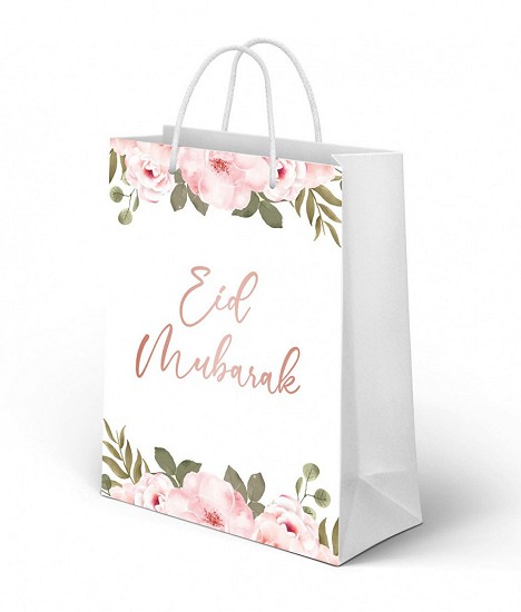 Sac cadeau en carton renfore avec inscription "Eid Mubarak" (Aid Moubarak) - Couleur Blanc fleuri avec inscription rose dore