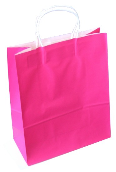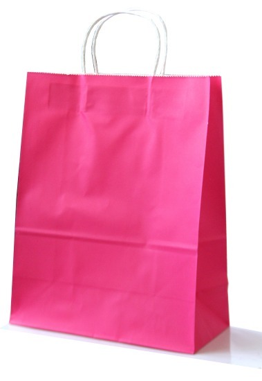 Sac cadeau en papier robuste de couleur rose (27 x 22 x 11 cm).