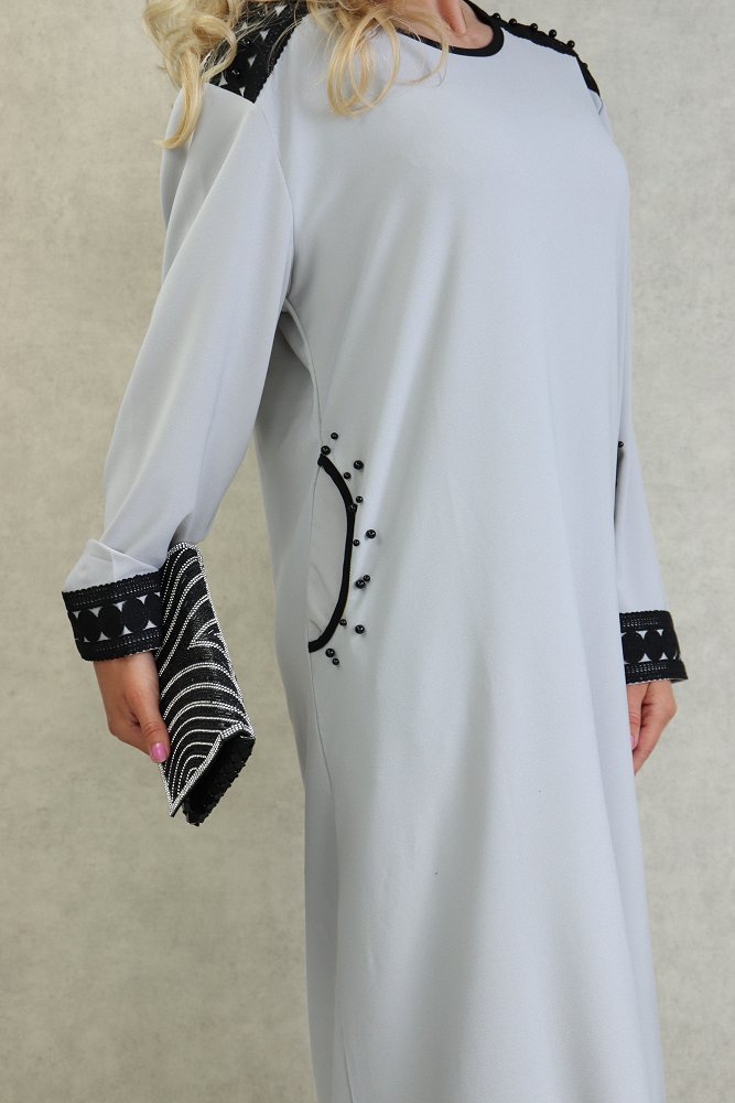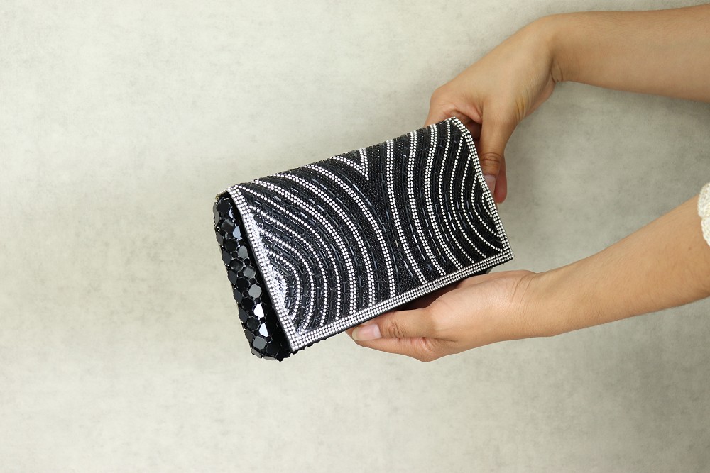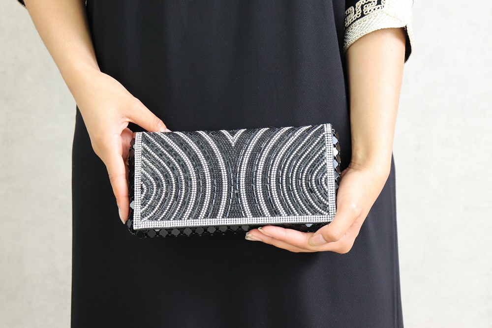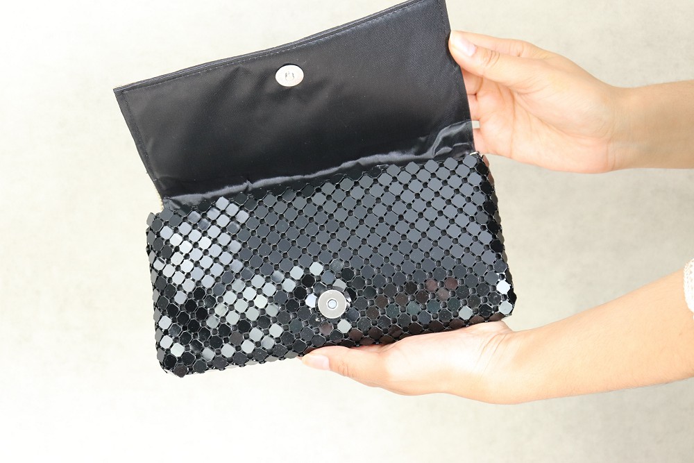 Élégante pochette de soirée en tissu art déco en rehaussé de sequins. Il se porte à la main ou à l'épaule grâce à sa bandoulière en chaînette amovible. Doté d'un rabat avec bouton pression.