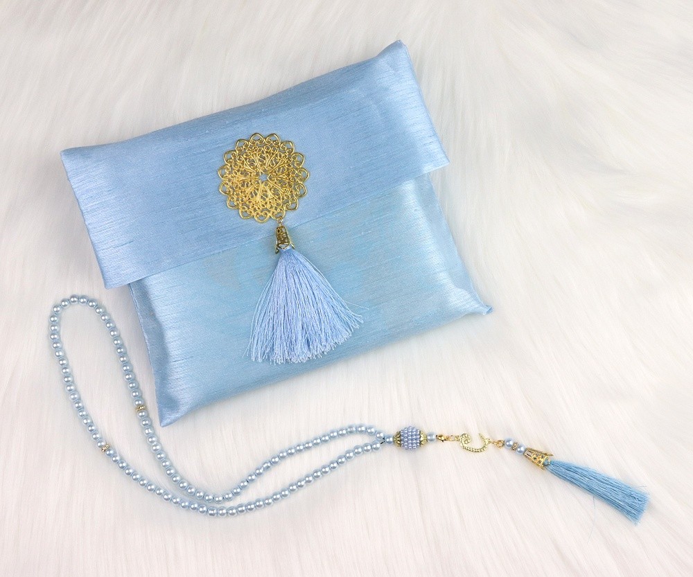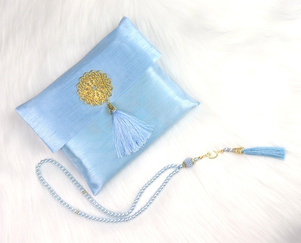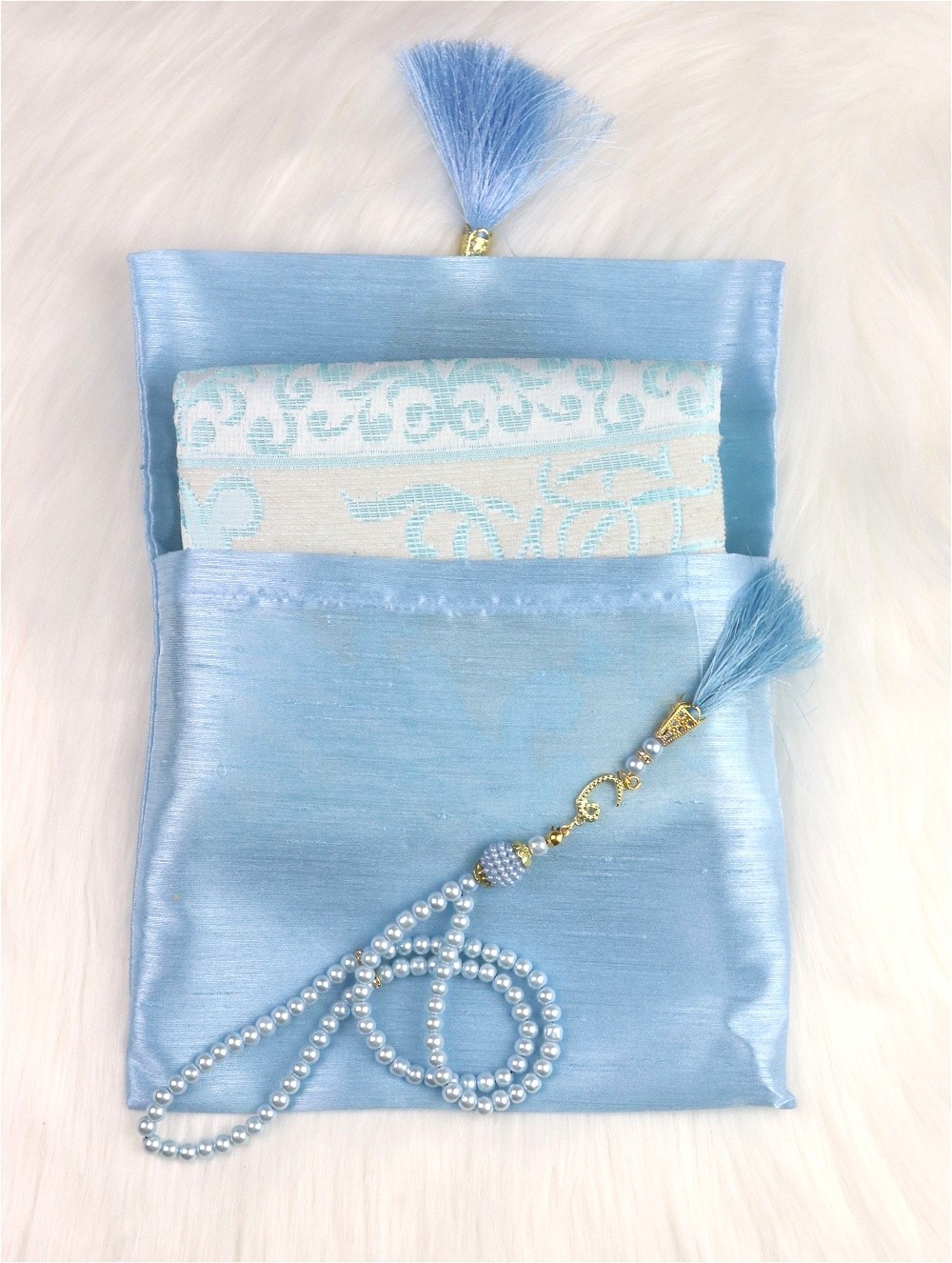Belle sacoche cadeau en tissu brillant avec médaillon métallique doré et son pompon en sabra contenant un tapis brodé (taille adulte) et un chapelet (Sebha) de 99 perles assorties.