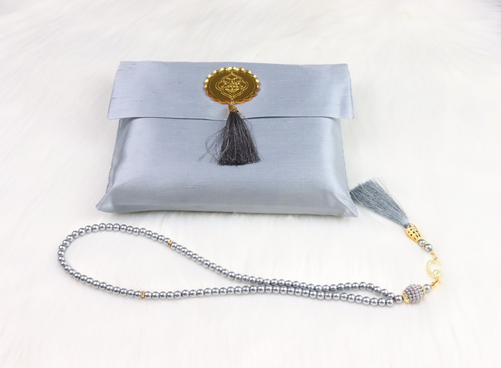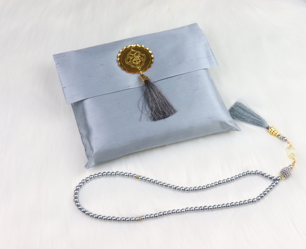 Sacoche cadeau : Pochette en tissu + Chapelet (Sebha) de luxe + Tapis de priere adulte - Couleur gris
