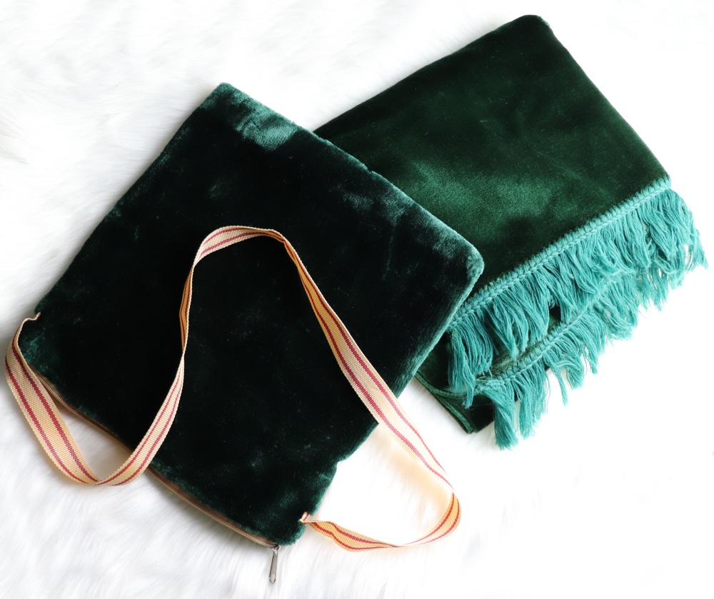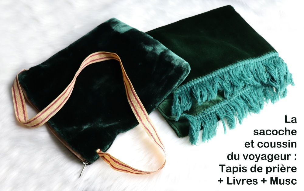 Recevez ce sac de voyage original avec fonction coussin (oreiller) de couleur vert assortis. Cette sacoche avec fermeture zip contient un tapis de prière adulte, un Coran Jouz' 'Ammâ, une citadelle du musulman, et un parfum musc sans alcool "Al-Baraka" de la marque "Musc d'Or" (mixte).