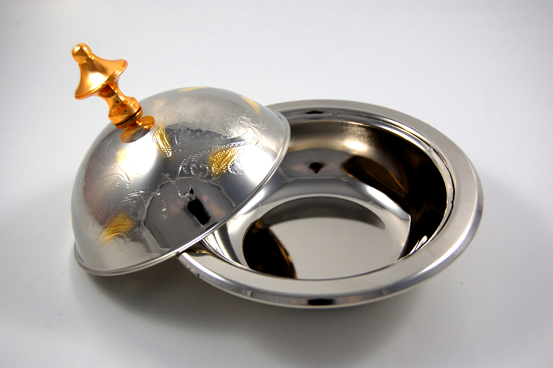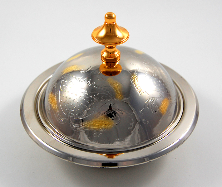 Sucrier, boite à bonbon (Récipient métallique avec couvercle) avec parties dorées, et orné de motifs décoratifs ciselés sur les façades, qui peut servir d'accessoire pour le rangement d'aliments ou de petits objet tels que des bijoux, tout comme il peut servir d'objet décoratif comme bibelot sur une table ou sur des étagères.