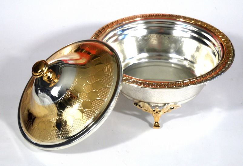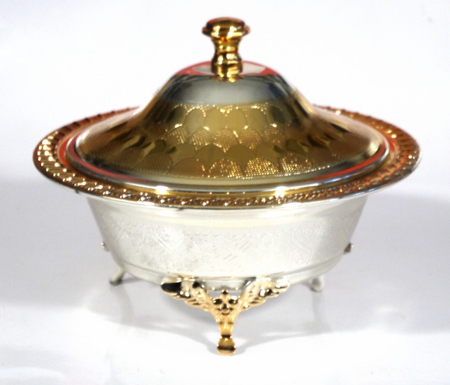 Très beau sucrier, boite à bonbon (Récipient métallique rond avec couvercle argenté avec parties dorées) peut également servir à présenter des fruits secs, des dattes, etc.