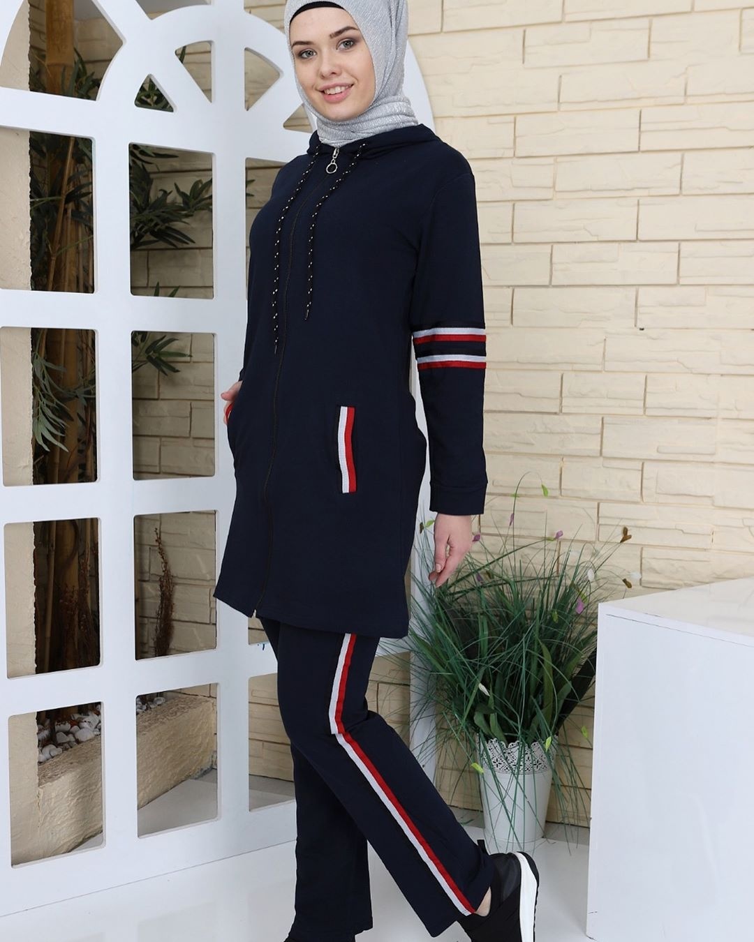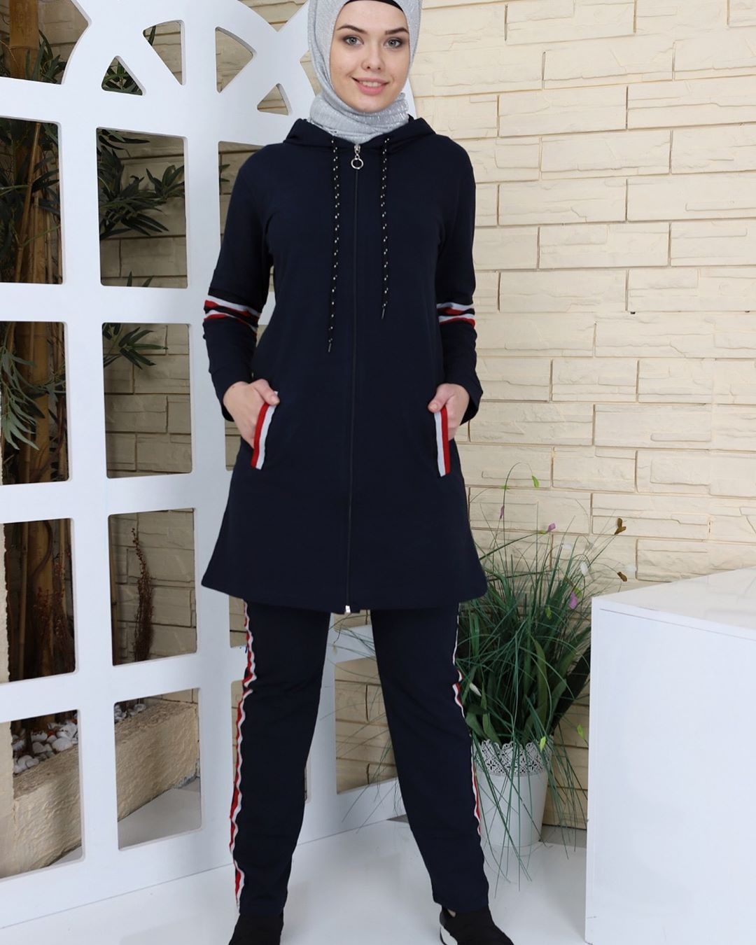 Survetement a capuche de couleur noir avec bandes tricolores (Vetement de Sport pour femme musulmane voilee)