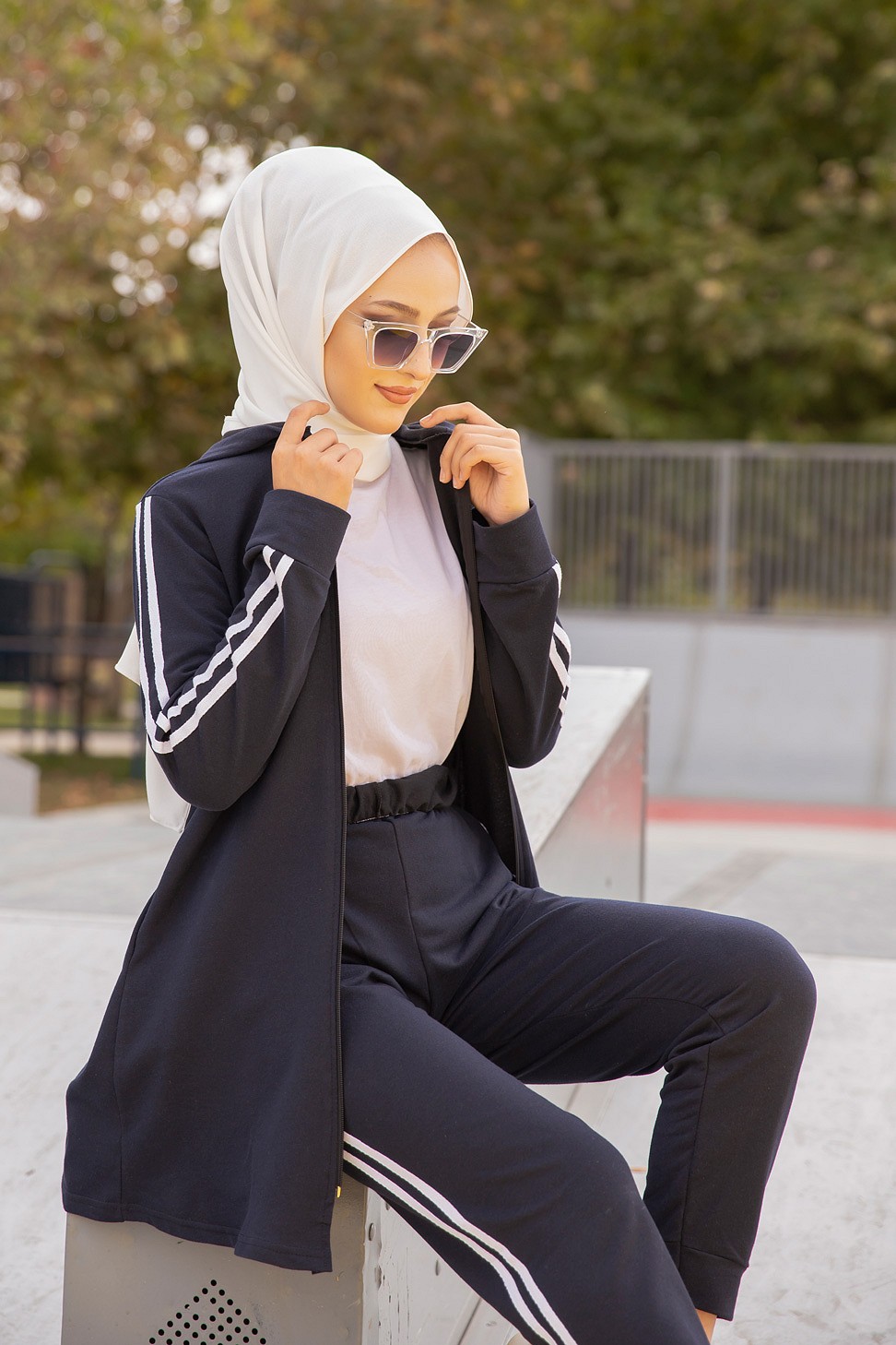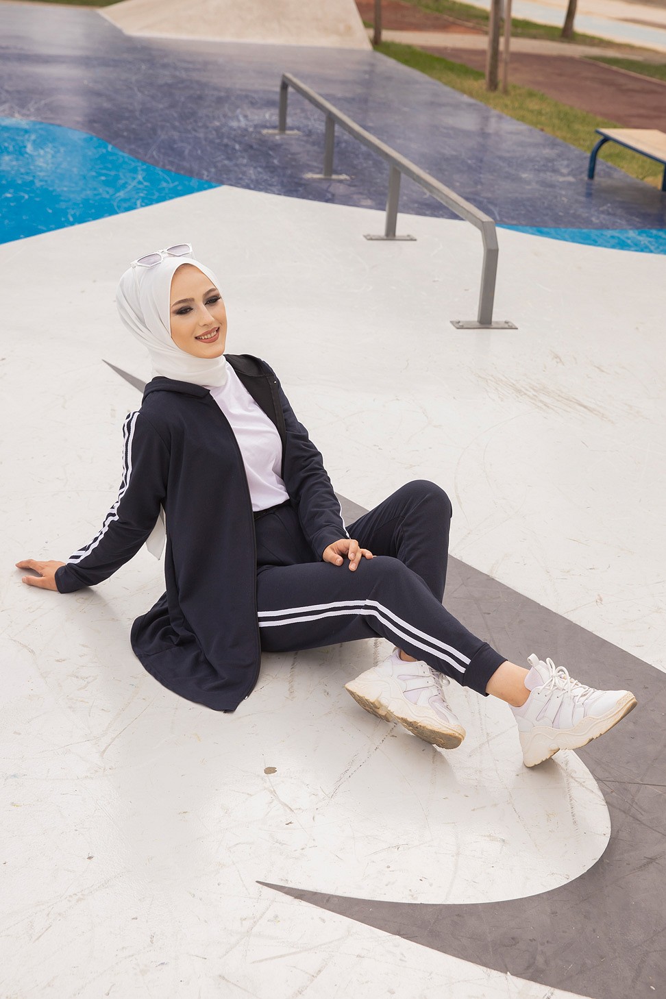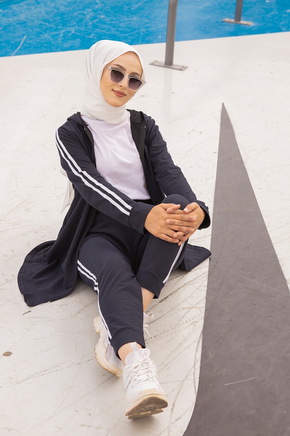 Survêtement deux pièces : Veste et Pantalon à bande blanche (Ensemble Sport Hijab pour femme) - Couleur bleu nuit Vetement & Accessoire