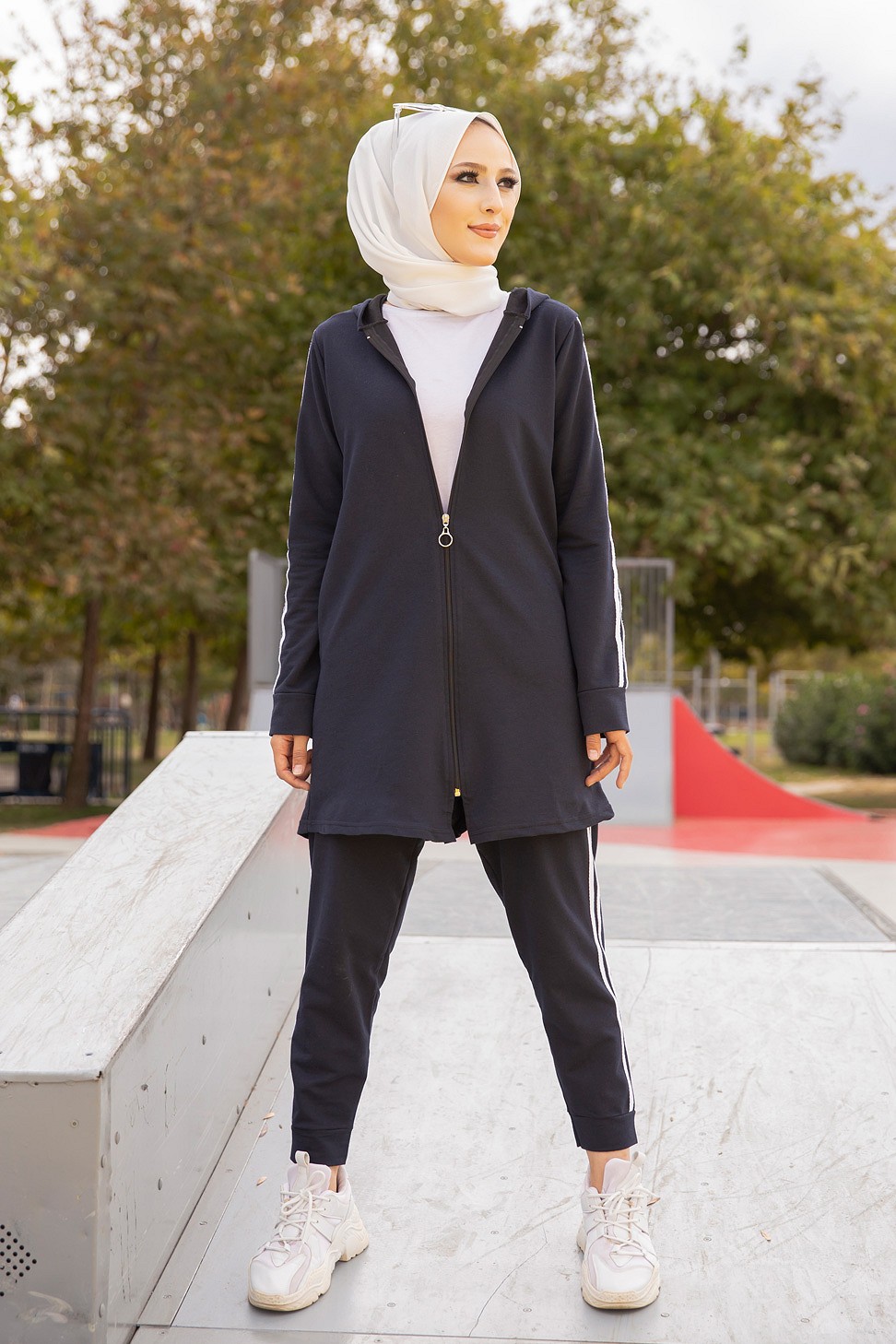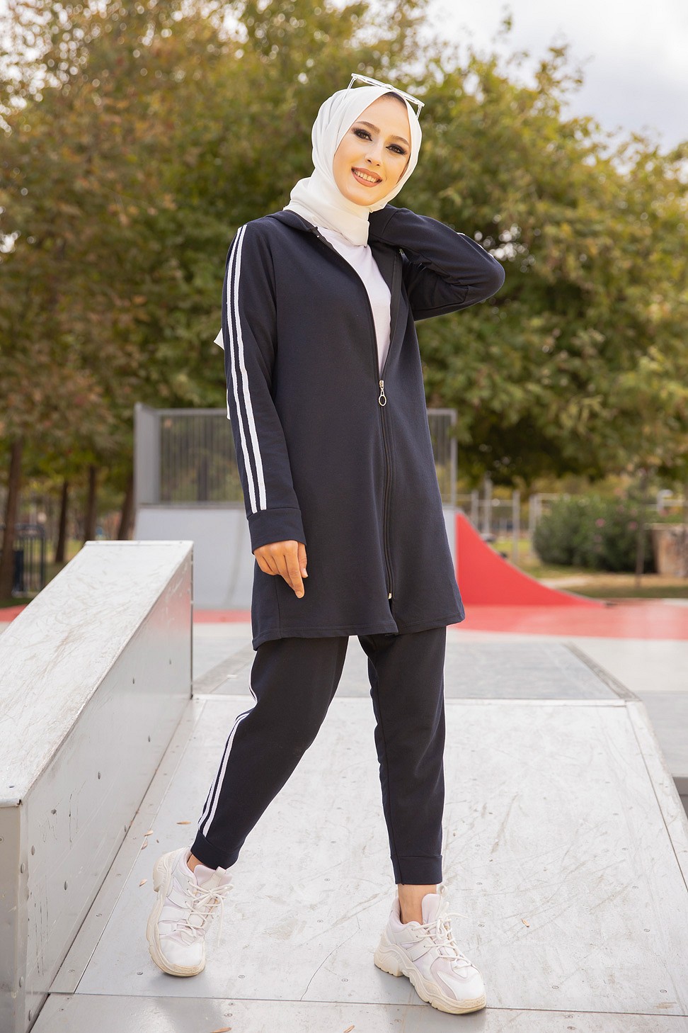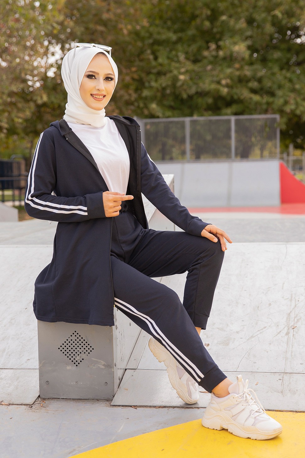 Survêtement deux pièces : Veste et Pantalon à bande blanche (Ensemble Sport Hijab pour femme) - Couleur bleu nuit Vetement & Accessoire