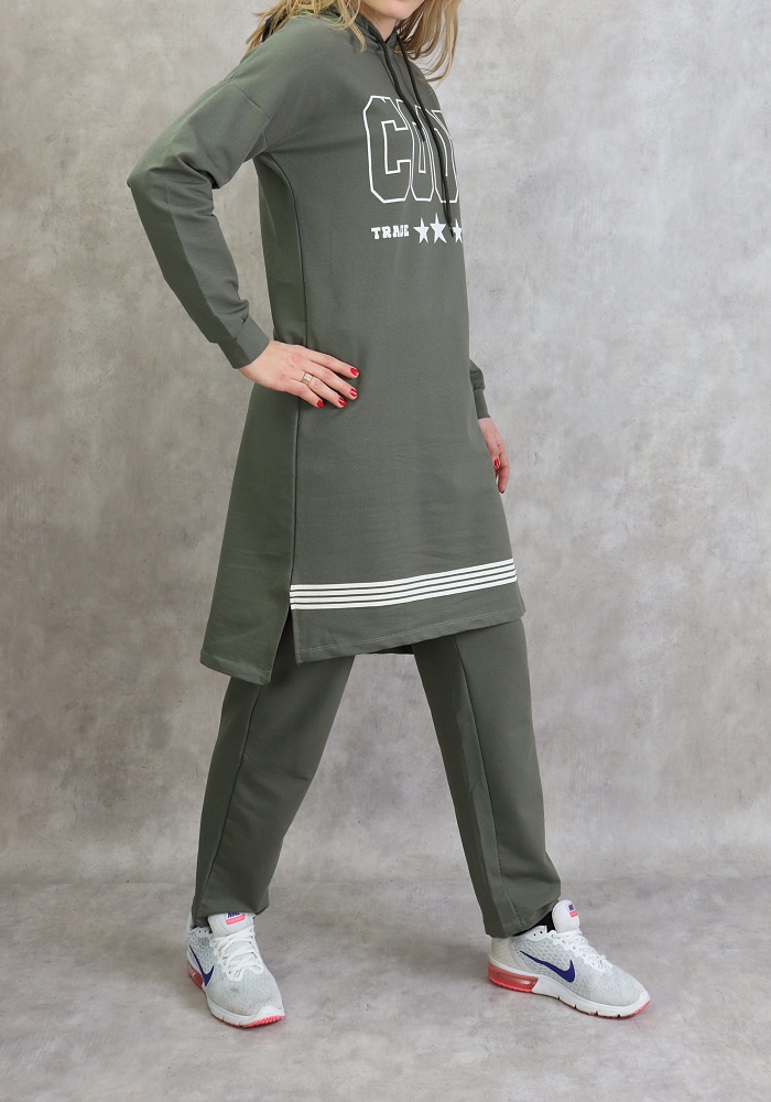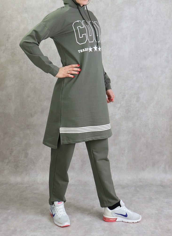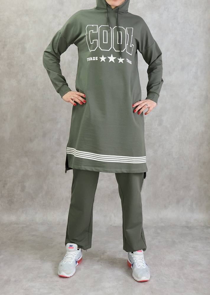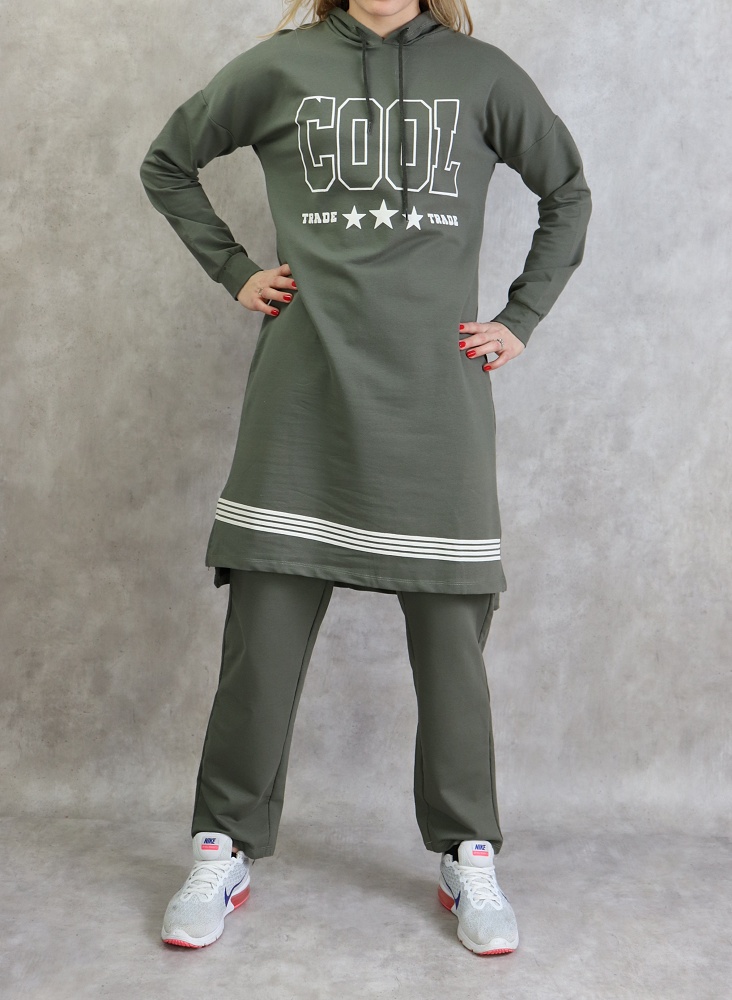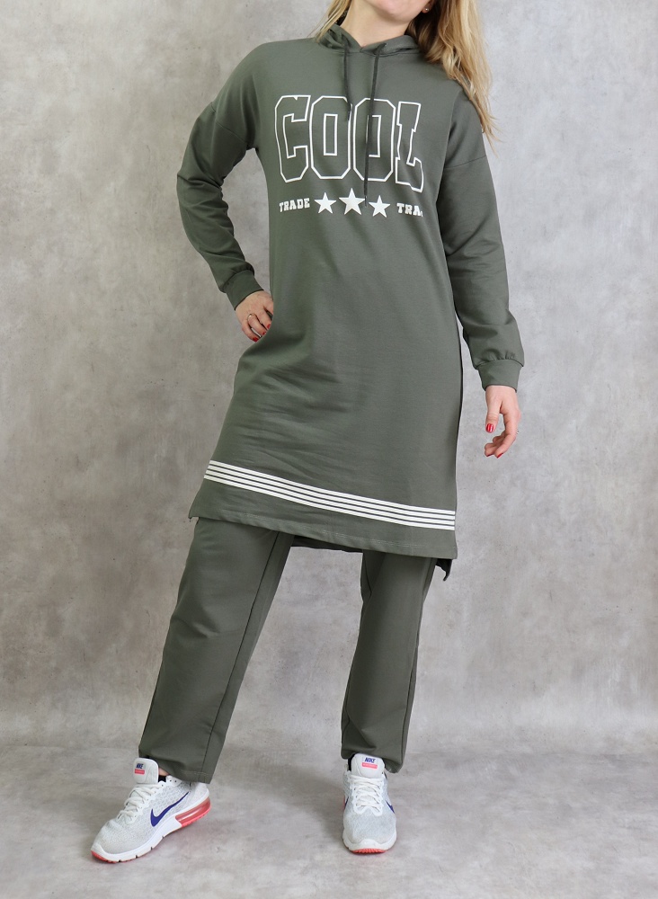 Survetement femme 2 pieces a capuche "COOL" de couleur kaki