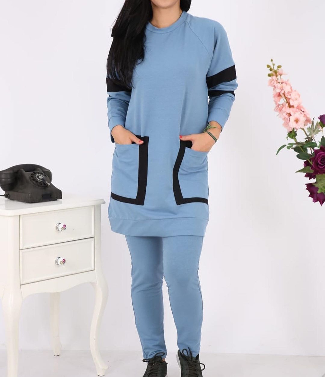 Ensemble 2 pièces. Sweat : mi longue, col rond, bandes noires, 2 grandes poches plaquées, matière sweat. Pantalon : coupe ajustée en bas, taille élastique.