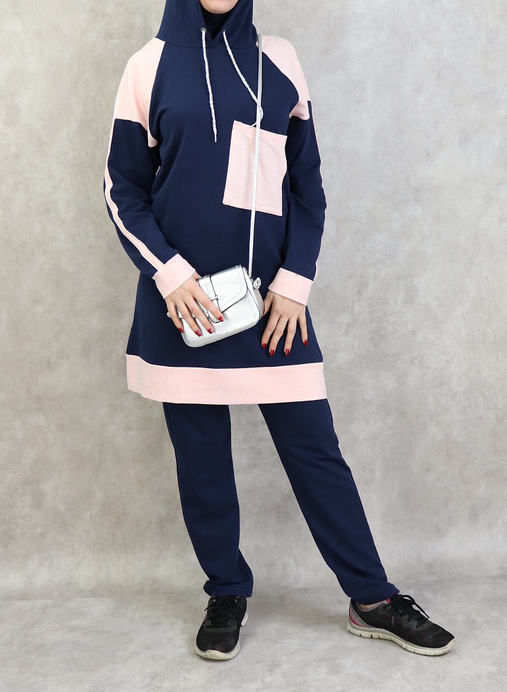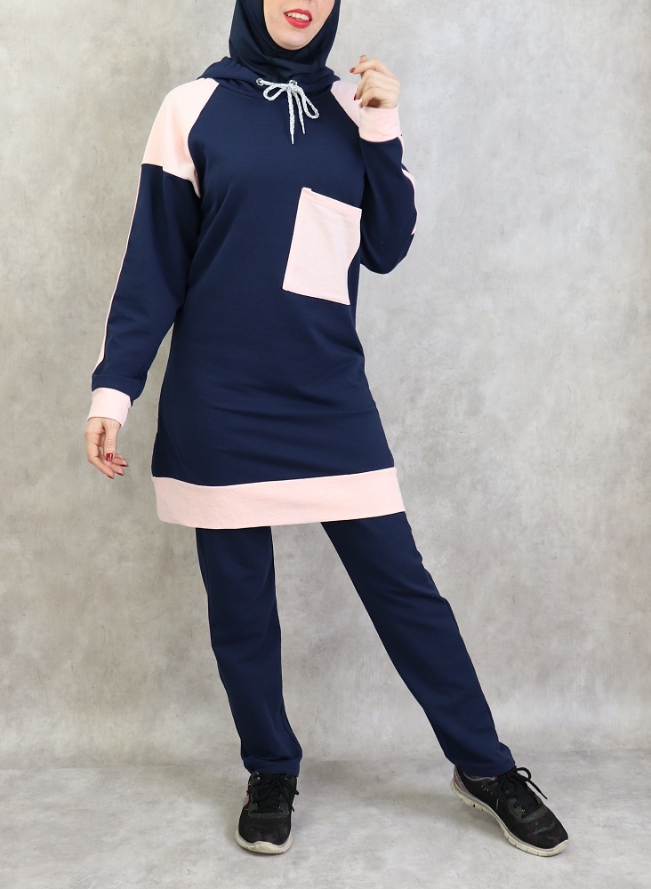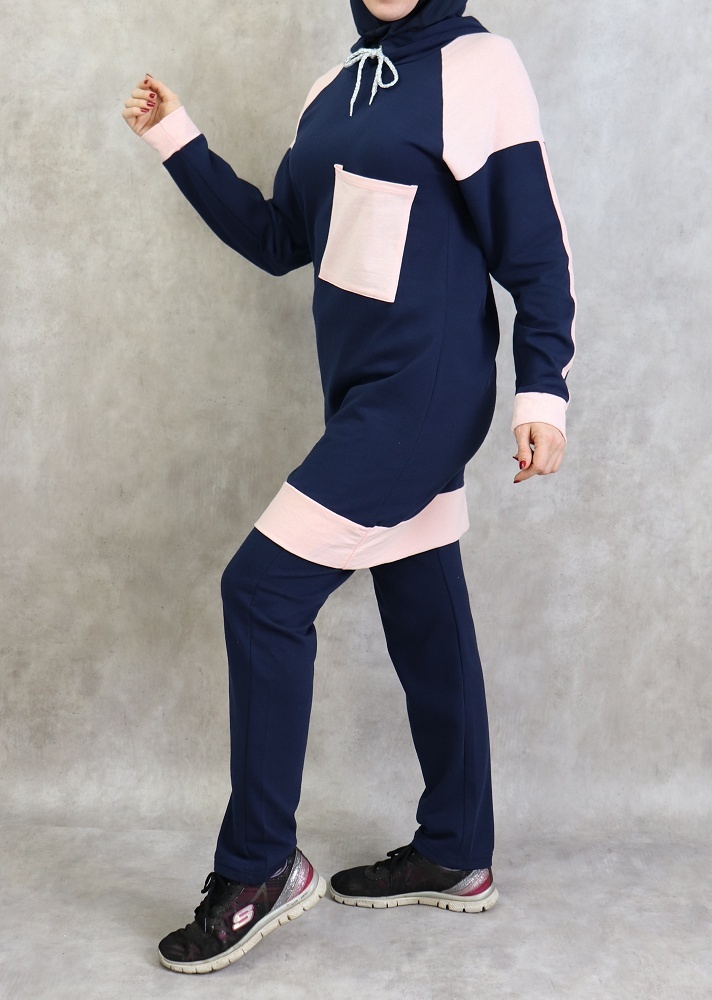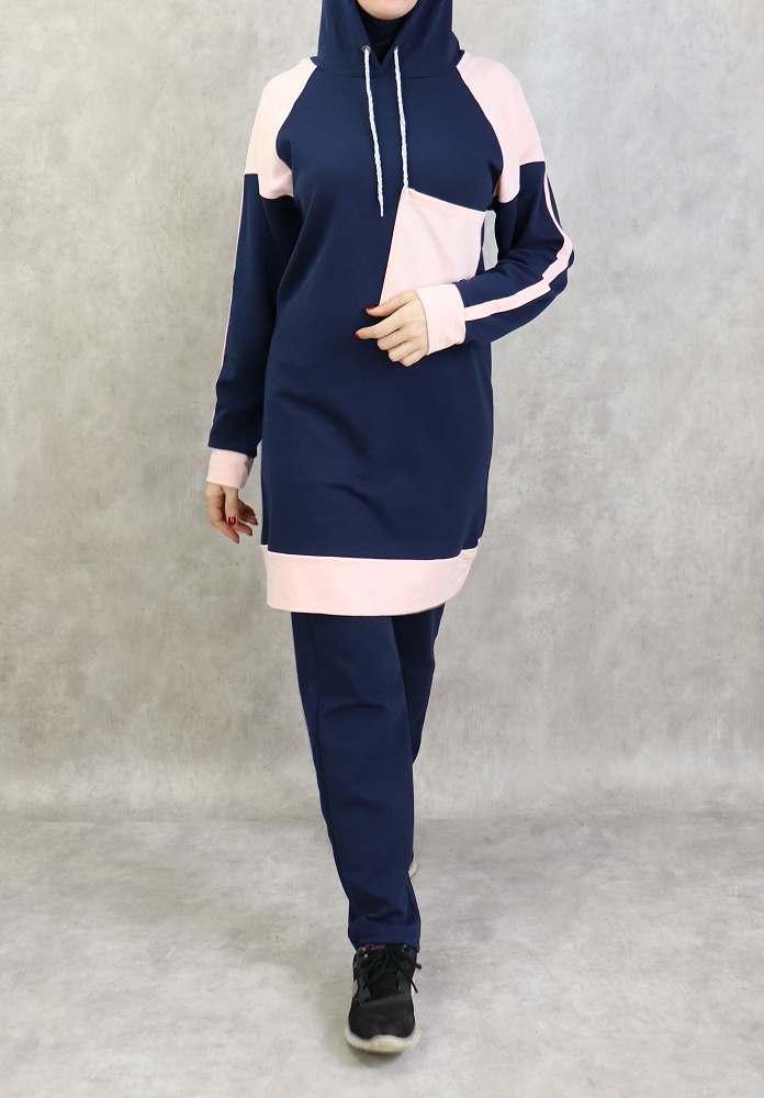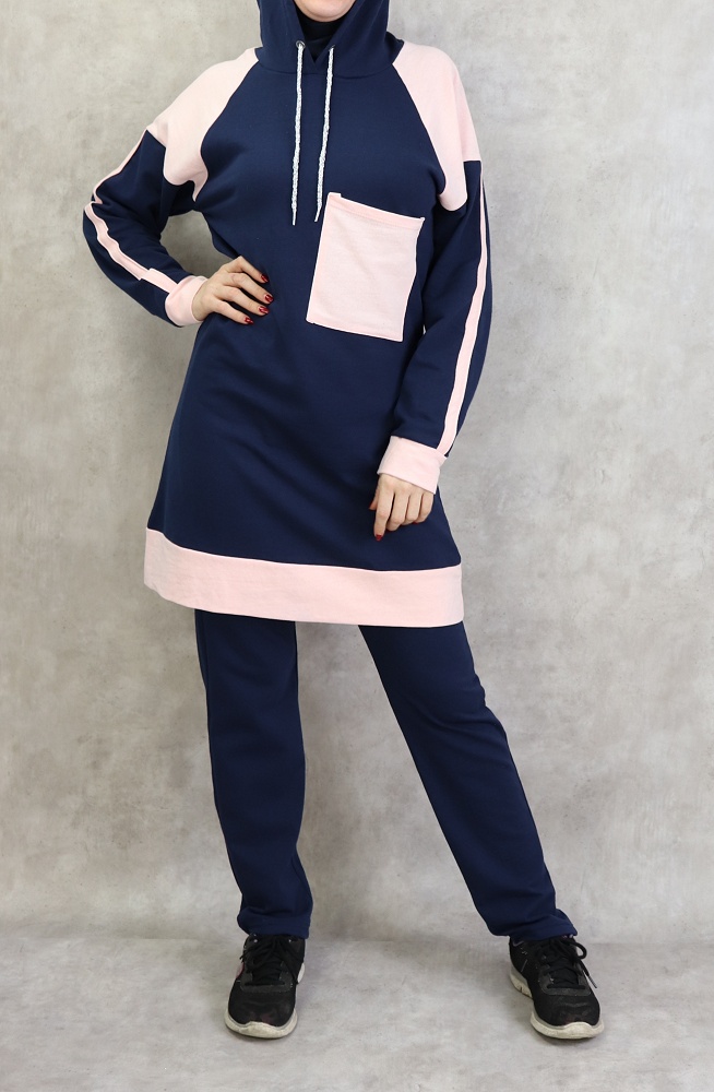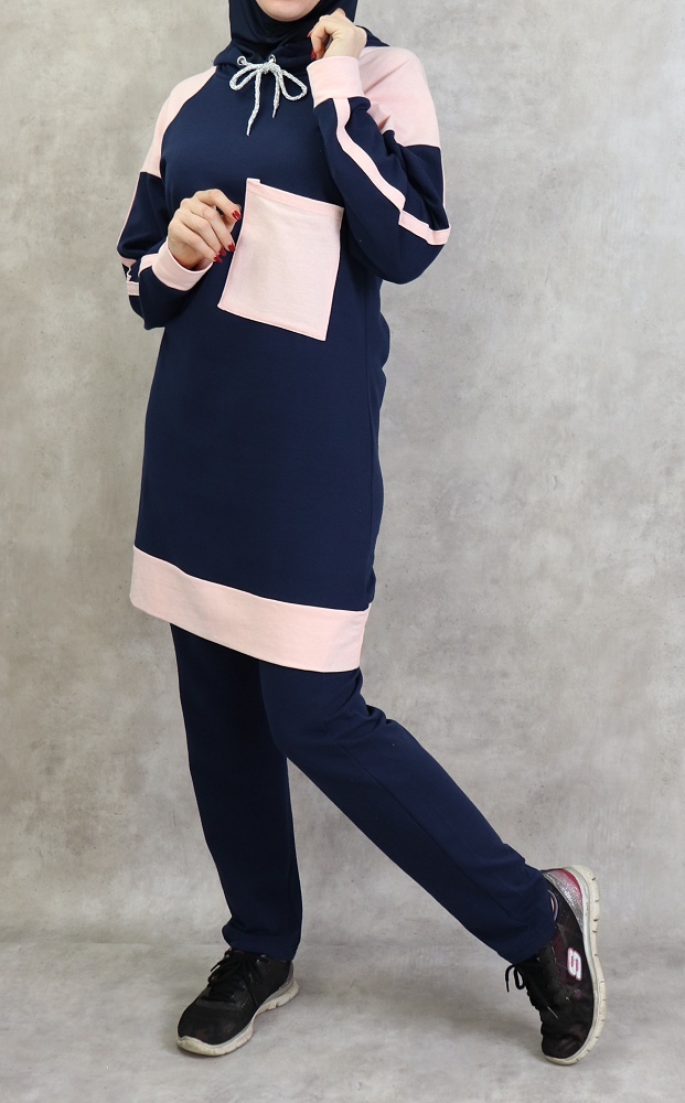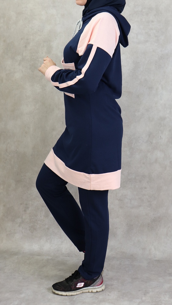 Survetement femme 2 pieces avec capuche de couleur bleu marine et rose clair (Grandes tailles disponibles)