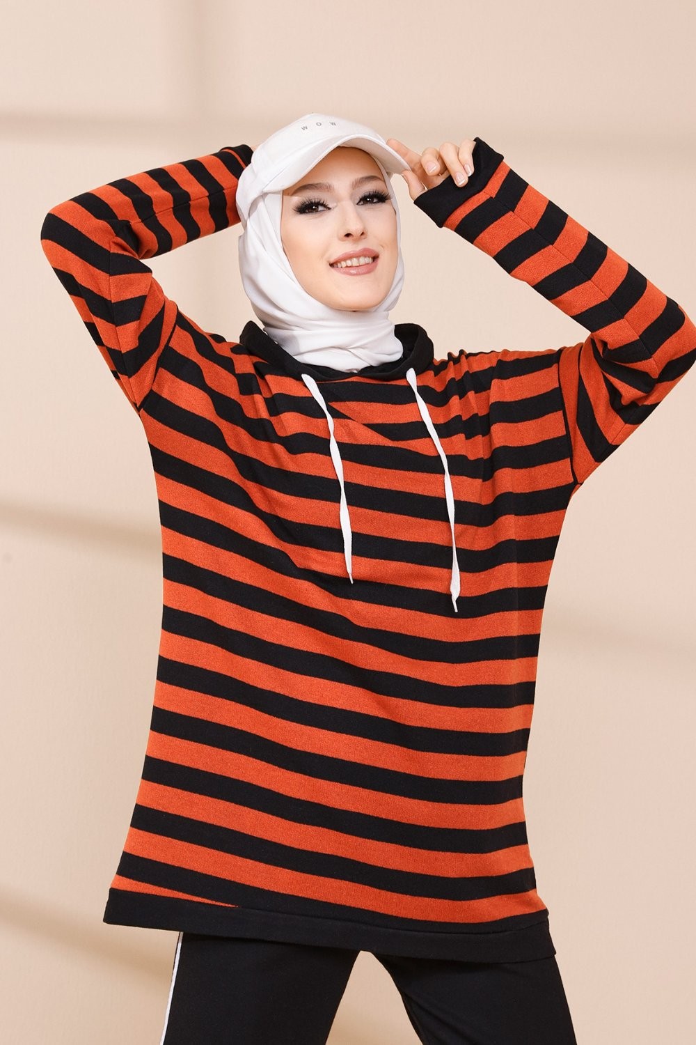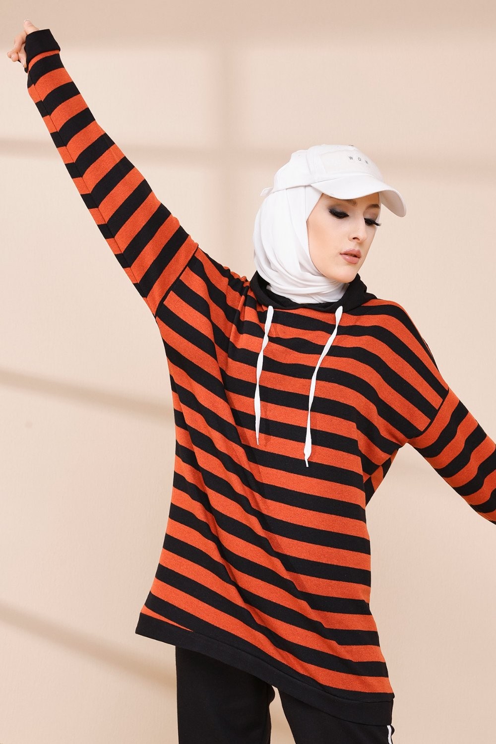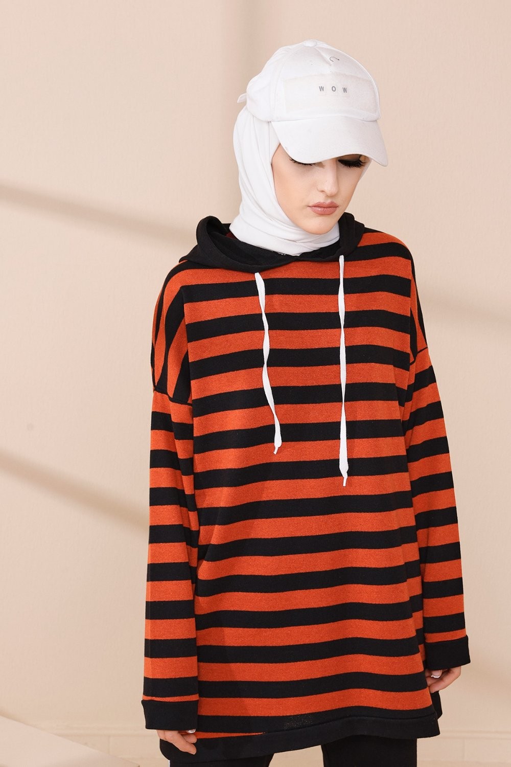 Tunique sportswear à rayures rouge bordeaux et noir pour femme (Modest Fashion) - REF. 32937 (19.90 €) - En Promotion à 16.90 €