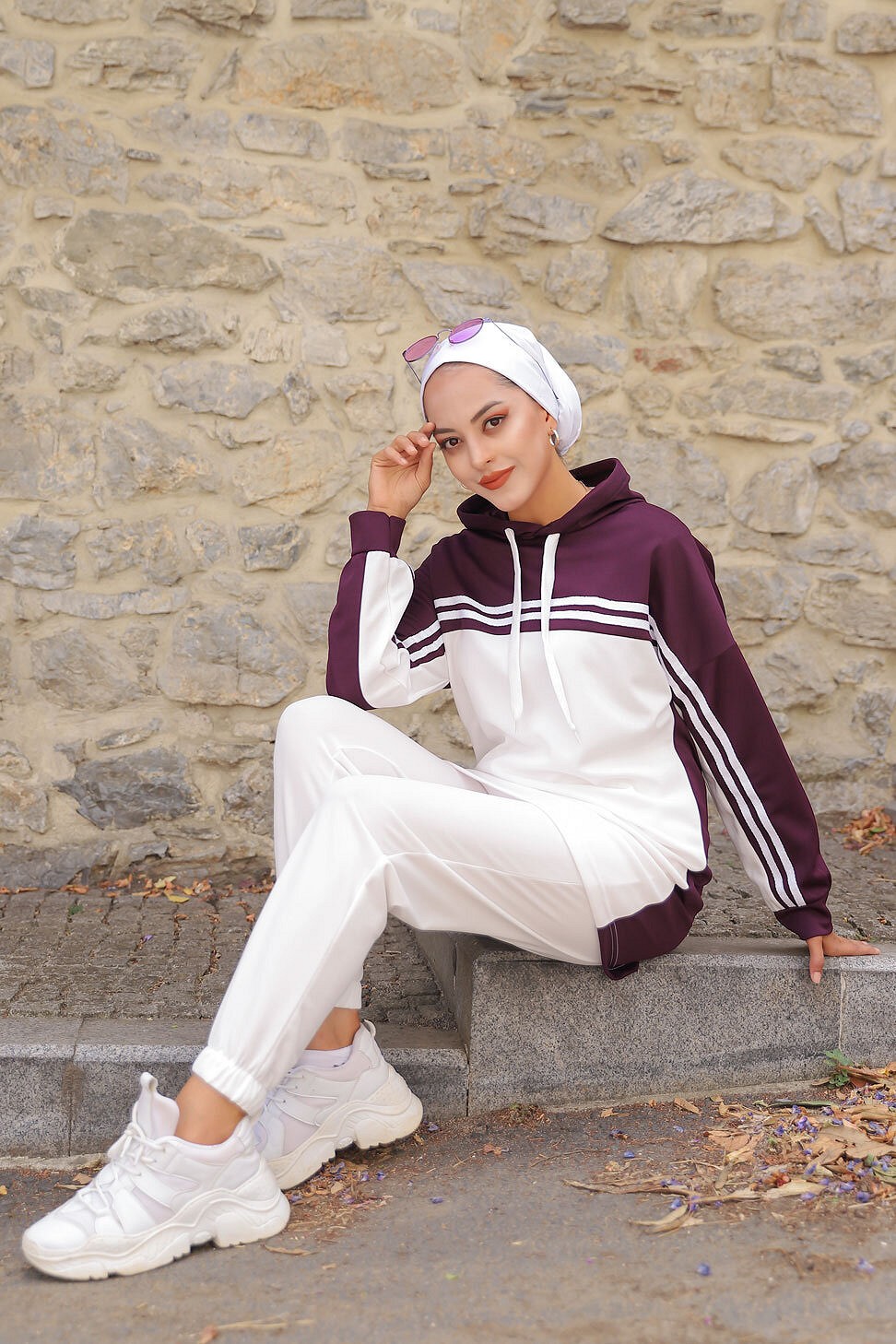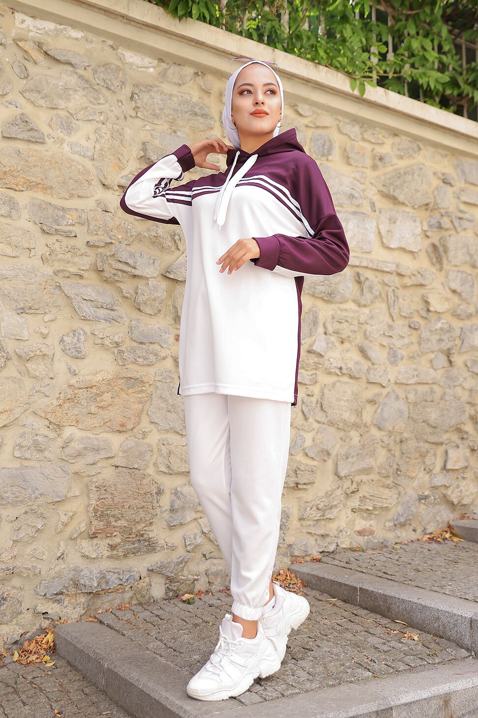Survêtement femme (Ensemble décontracté deux pièces sweat à capuche et pantalon) - Couleur Blanc et prune Vetement & Accessoire
