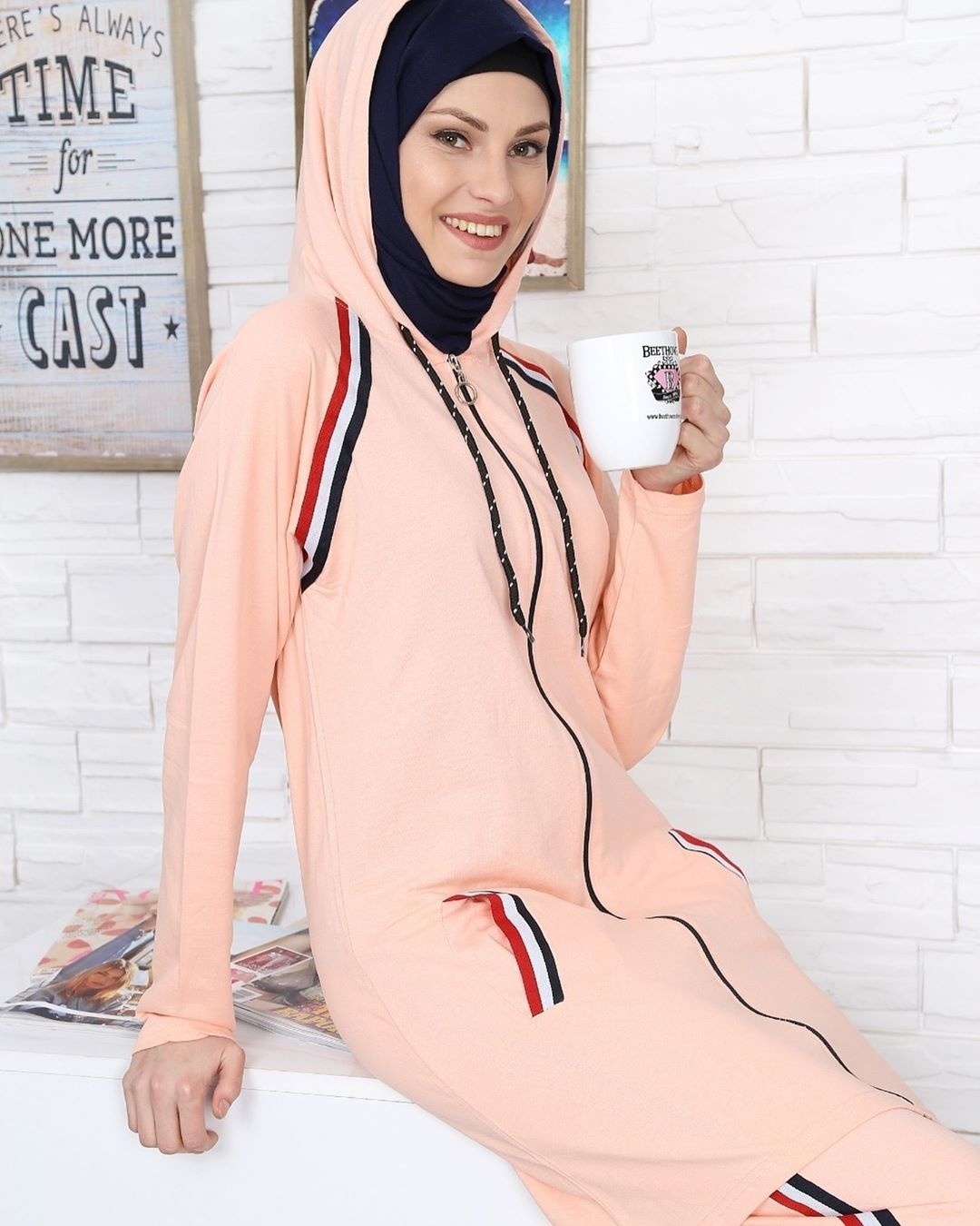 Survêtement 2 pièces. Veste : mi longue, capuche avec liens de serrage, fermeture zippée, 2 poches latérales, coupe droite, matière sweat. Pantalon : coupe droite, taille élastique.
