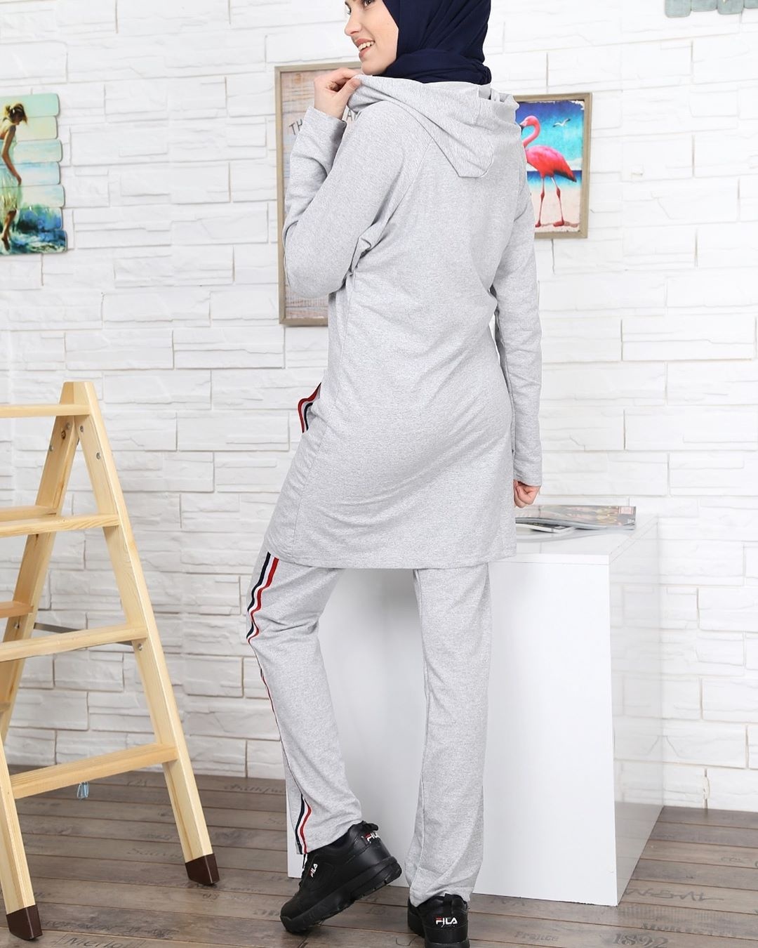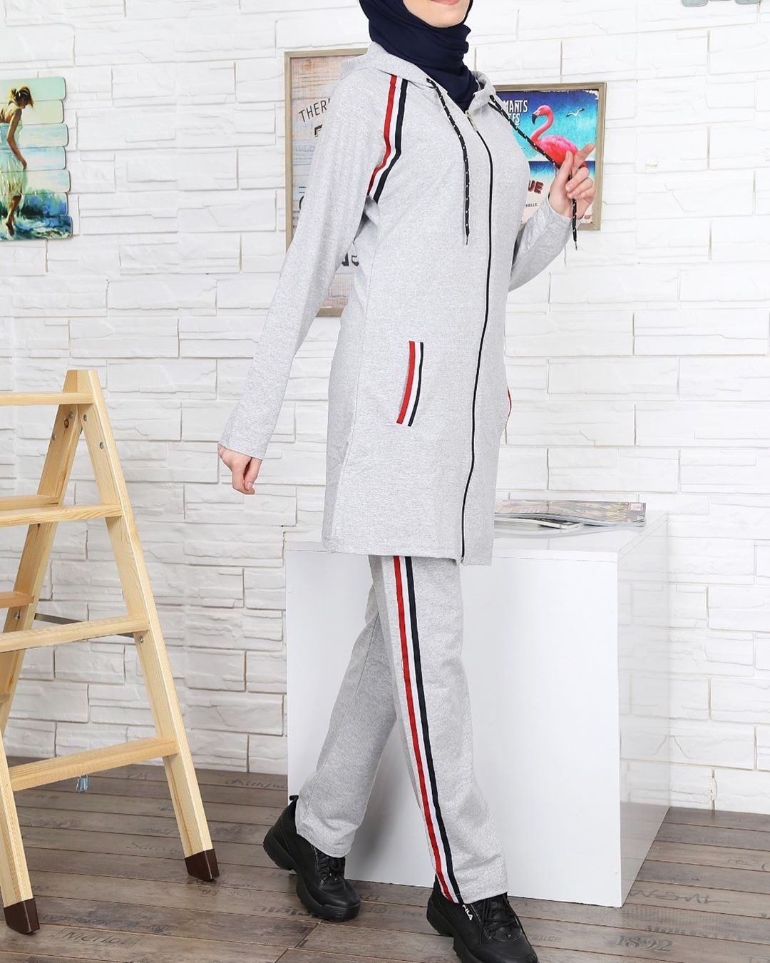 Survetement femme a capuche de couleur gris clair chine avec bandes tricolores (Vetement Sport - Hijab - Turquie)