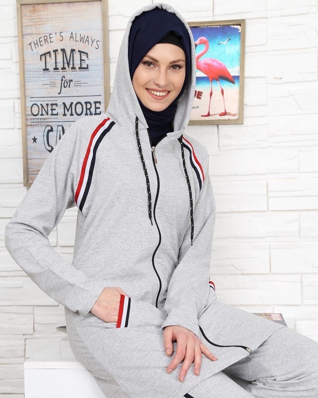 Survêtement femme à capuche de couleur gris clair chiné avec bandes tricolores (Vetement Sport - Hijab - Turquie) Vetement & Accessoire