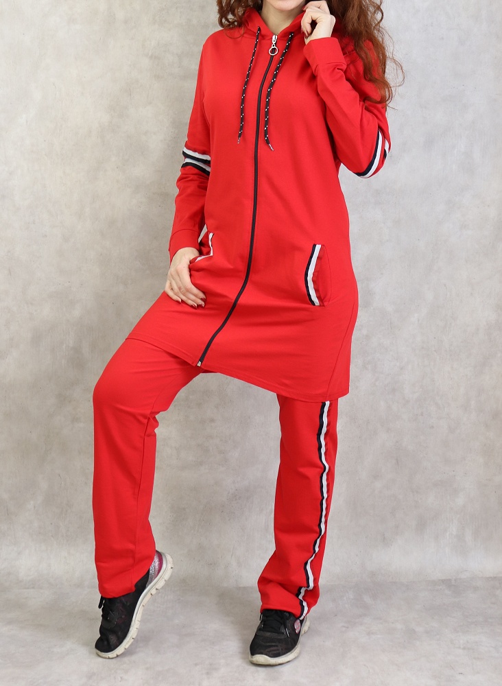 Survetement femme a capuche de couleur rouge avec bandes tricolores (Grandes tailles)