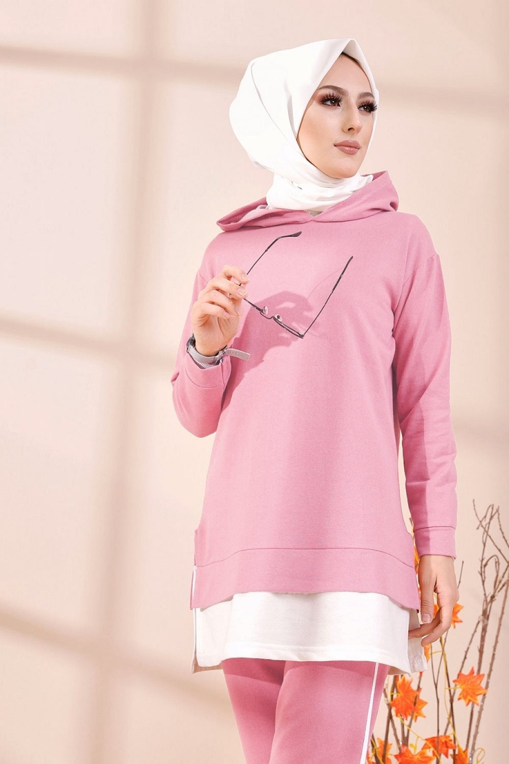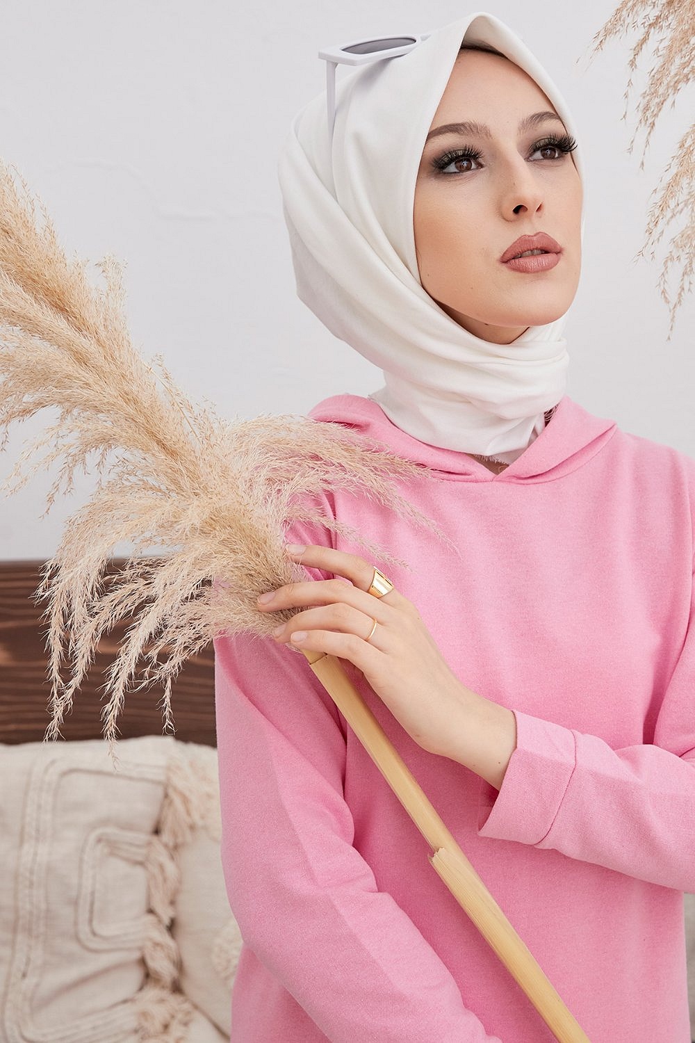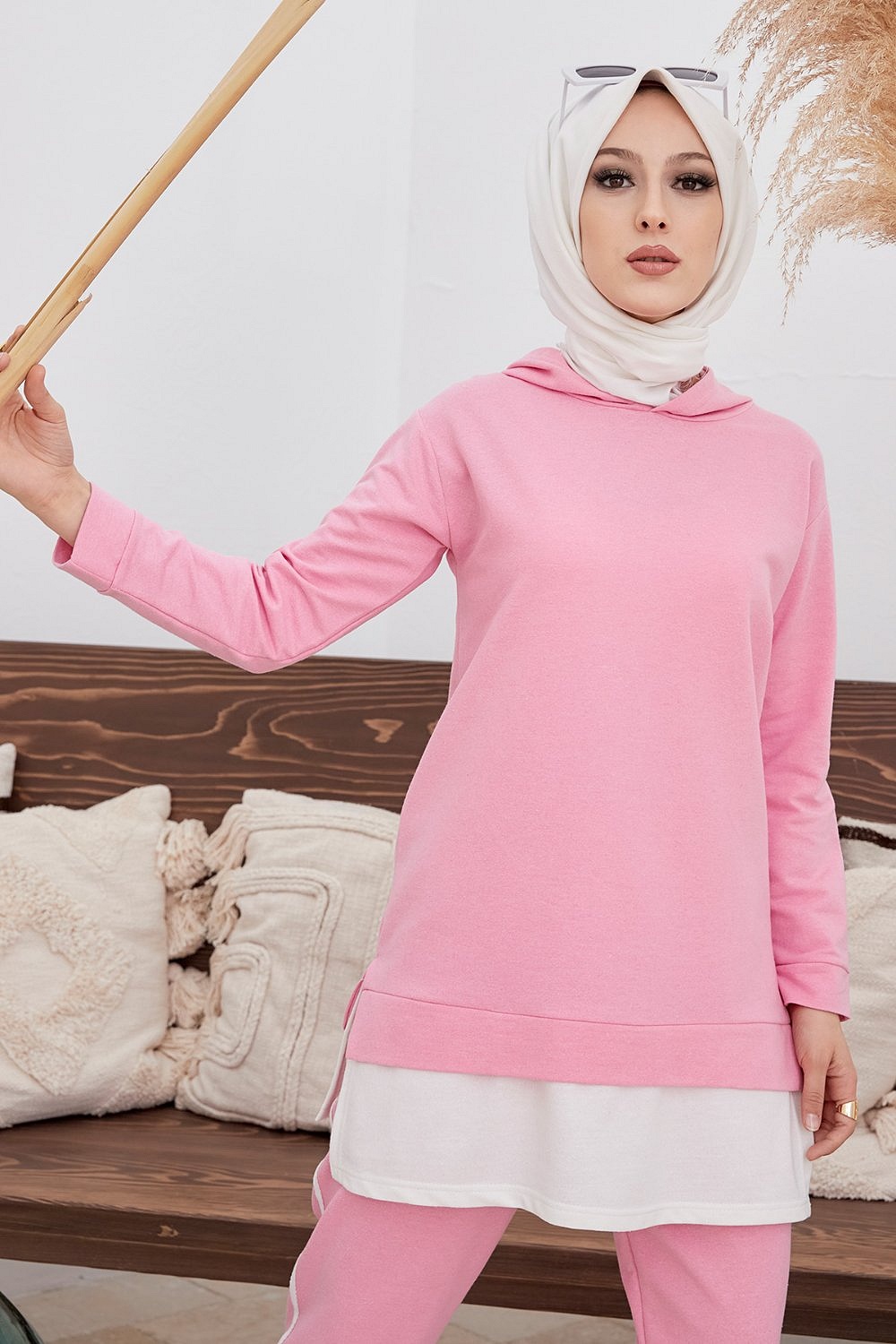 Tunique sportive bicolore pour femme musulmane - Sweat à capuche tendance pas cher - Couleur blanc et rose - REF. 33837 (19.90 €)