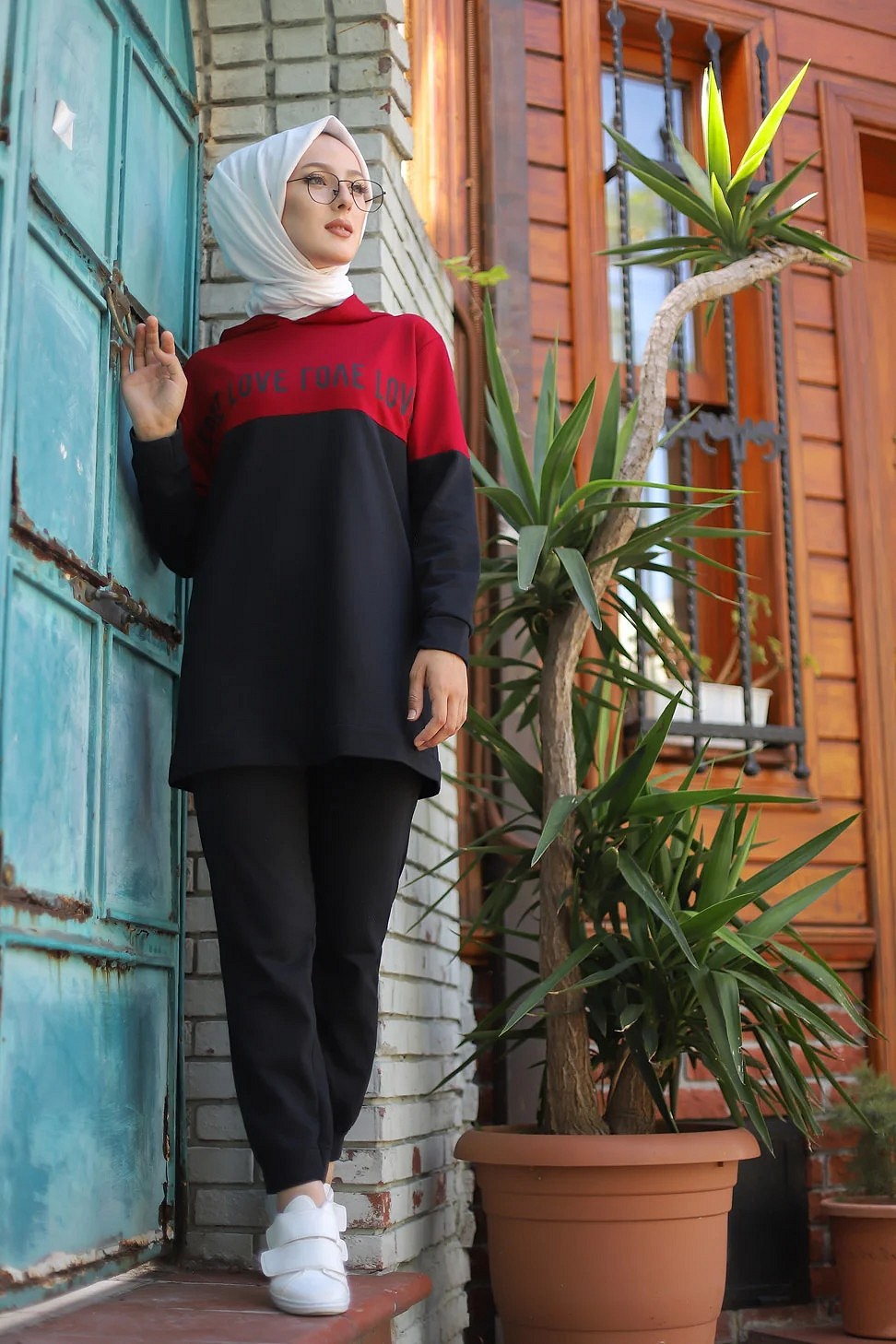 Ensemble survêtement décontracté (Vêtement de sport pour femme voilée) - Tunique couleur noir et pantalon rouge - REF. 36675 (29.00 €)