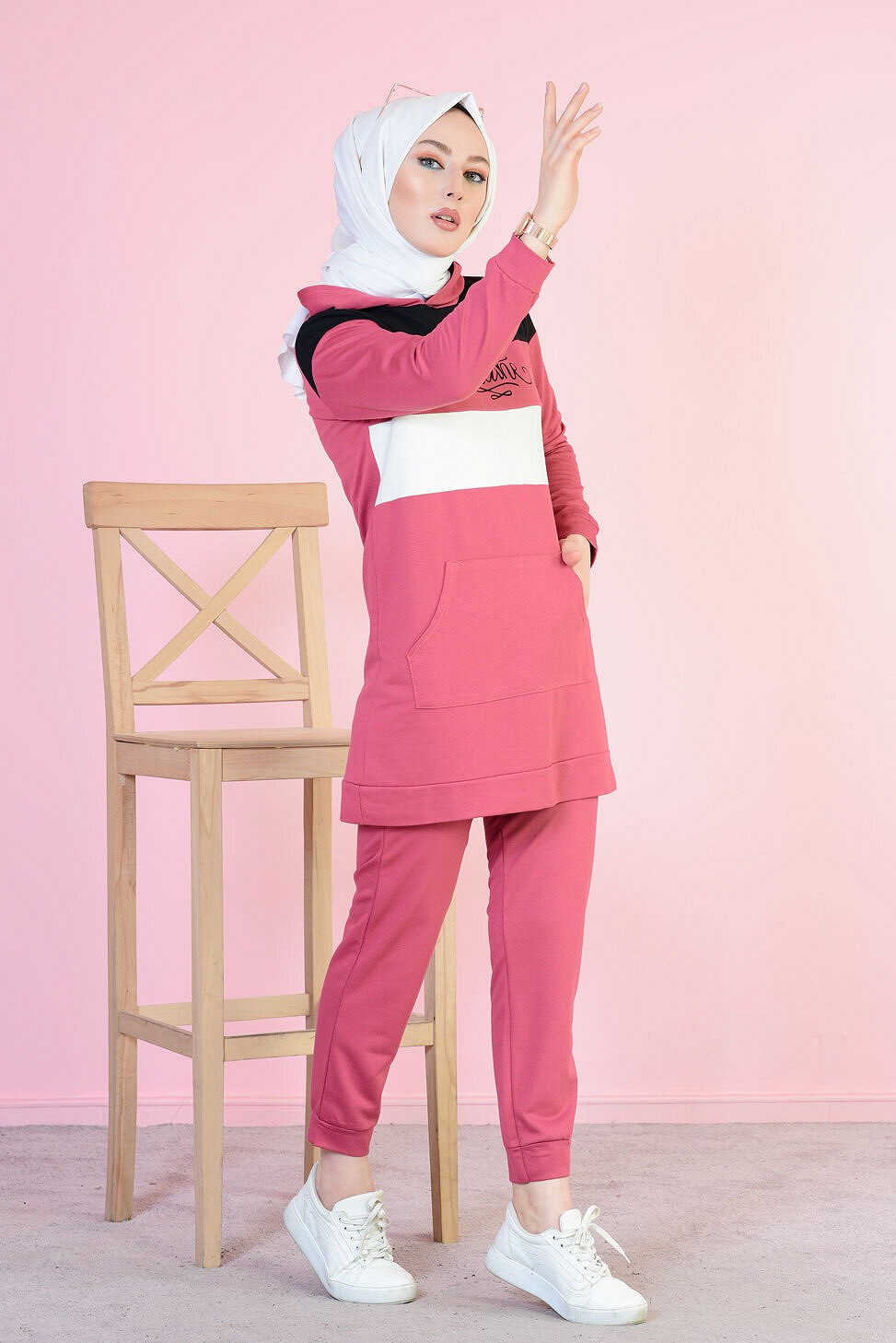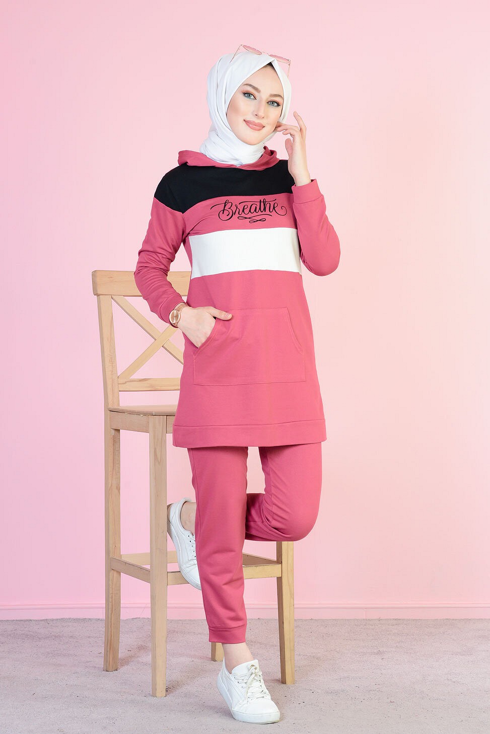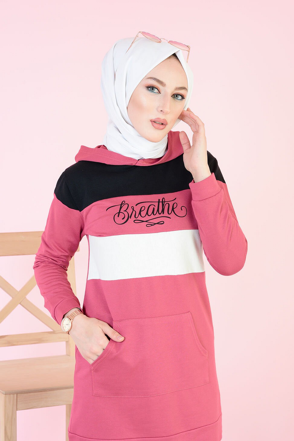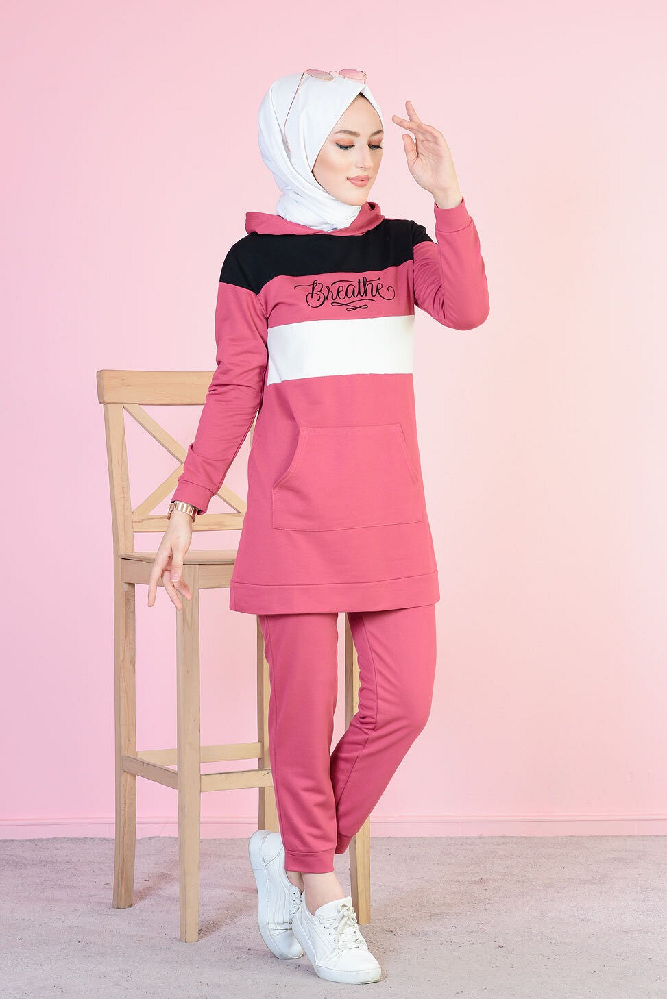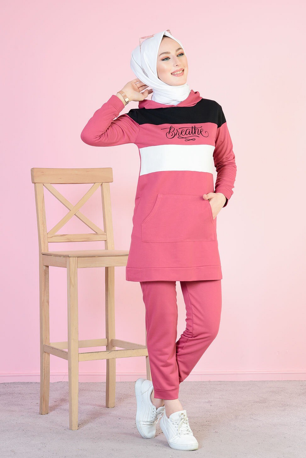 Survêtement tricolore à capuche imprimé "Breathe" (Vetement de sport pour femme musulmane) - Couleur Rose, noir et blanc Vetement & Accessoire