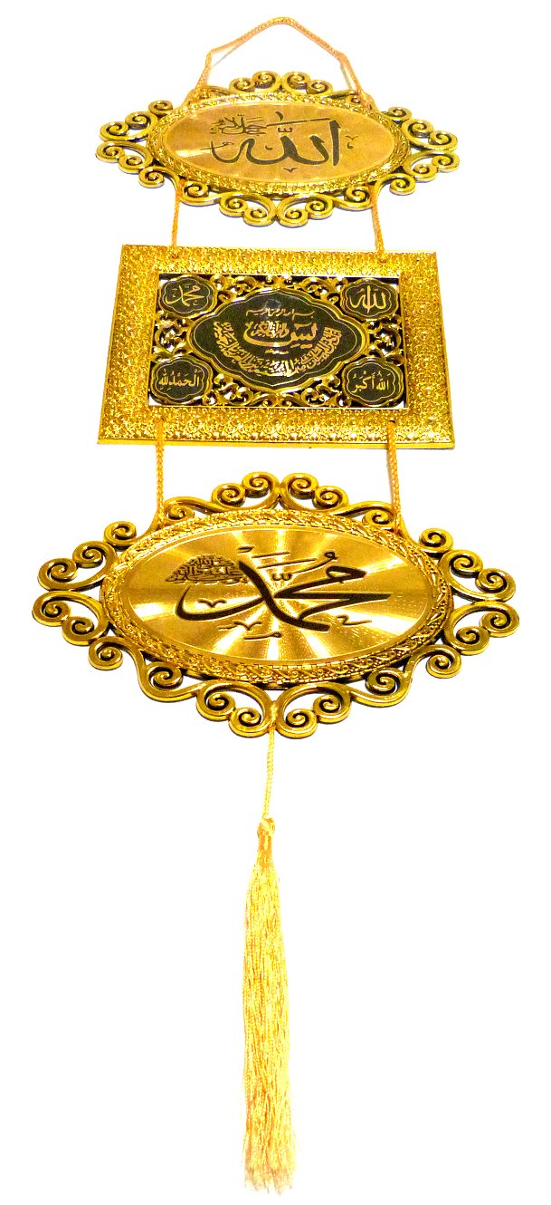 Les éléments du tableau contiennent les inscriptions suivantes : Allah, le début de la sourate Yassine et Mohammed.
