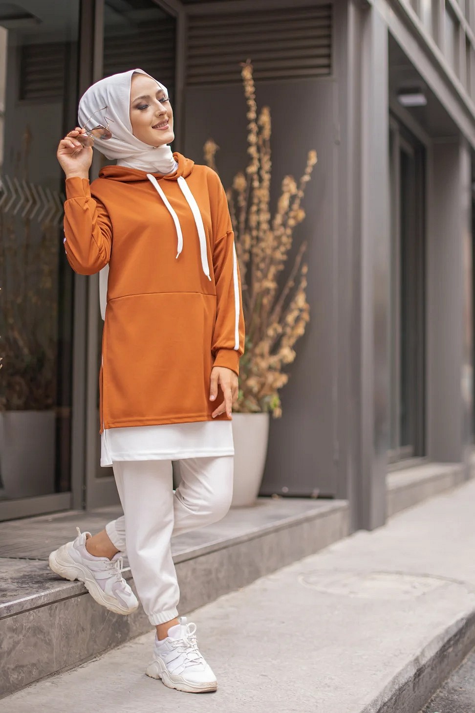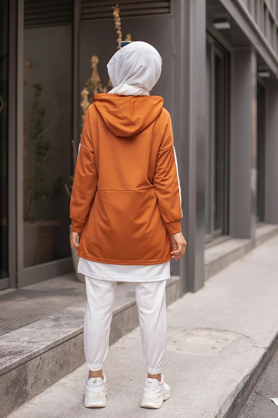 Tunique type sportswear, manches longues, col capuche à cordons de serrage contrastés. Extension de couleur blanche en bas de la tunique