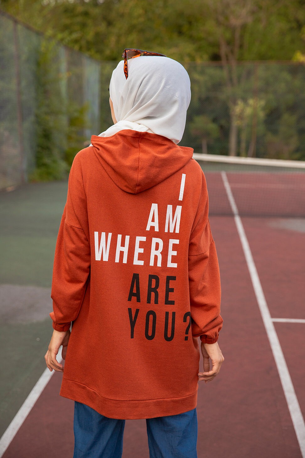 Sweat avec capuche pour femme inscription au dos "I am where are you?" (Tenue décontractée hiijab) - Couleur brique Vetement & Accessoire