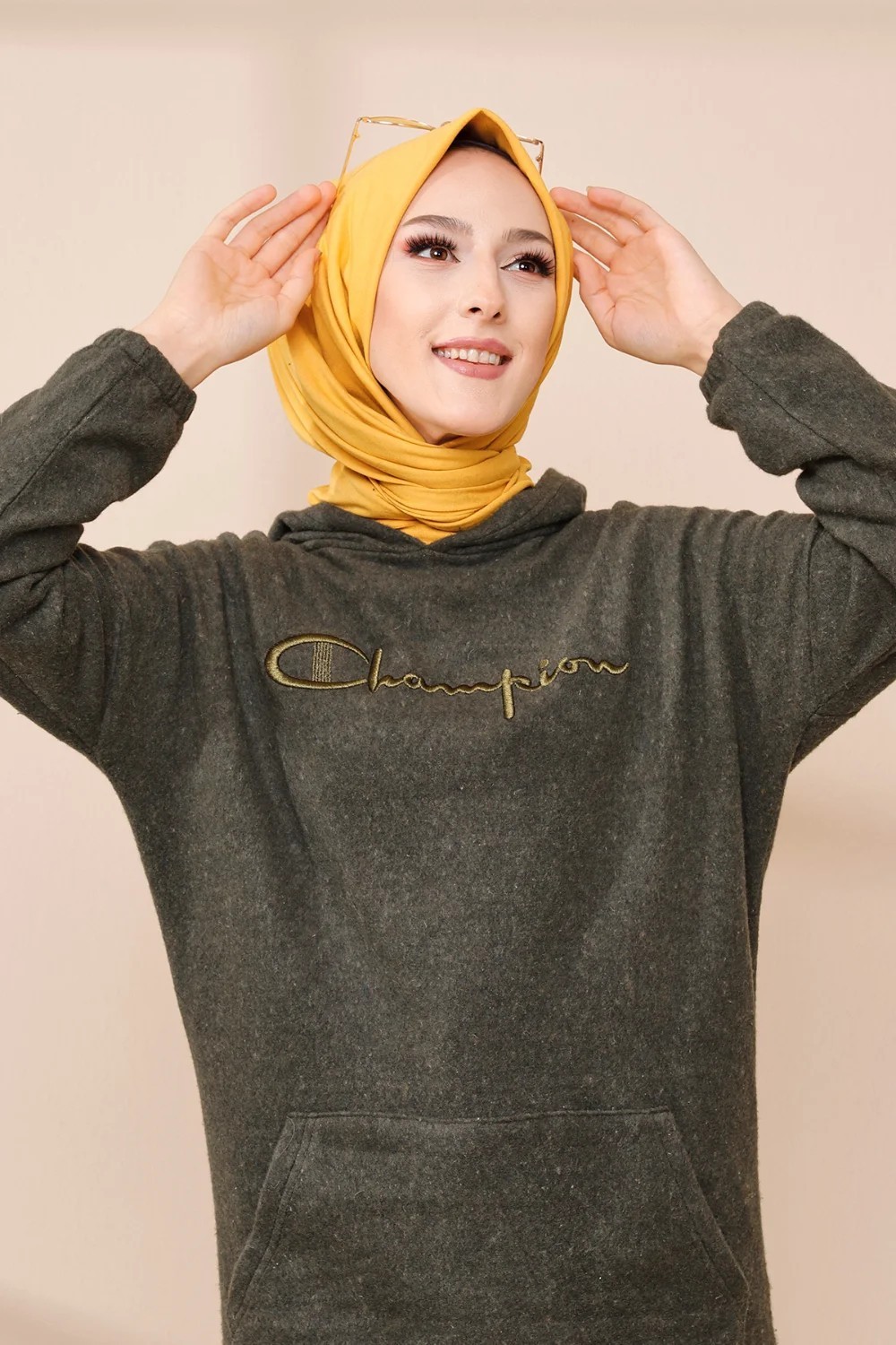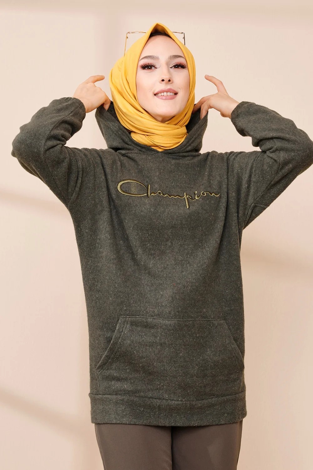 Sweat femme avec capuche brodé "Champion" (Saison Automne-Hiver) - Couleur kaki Vetement & Accessoire