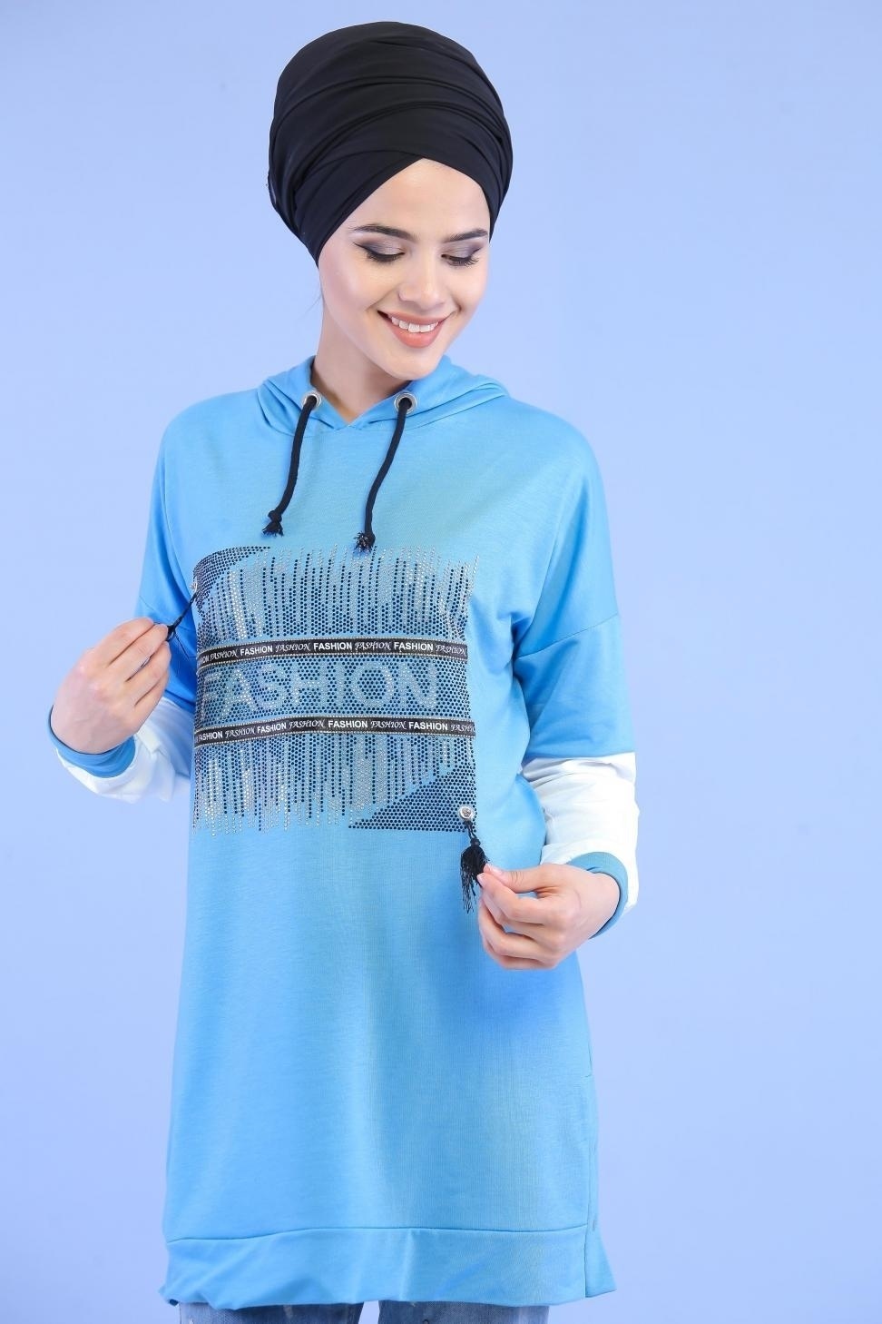 Sweat-shirt à strass inscription "Fashion" avec capuche pour femme - Couleur bleu clair Vetement & Accessoire