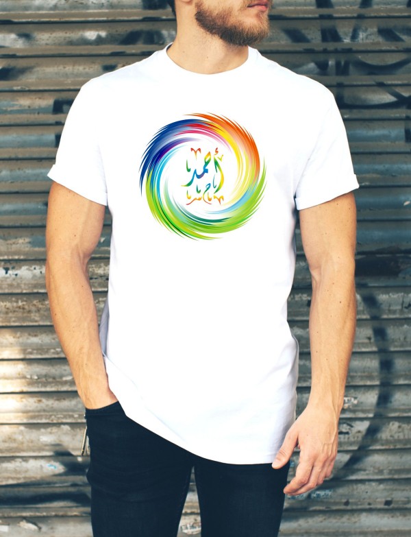 T-Shirt multi-couleurs personnalise avec un prenom calligraphie en arabe et message optionnel