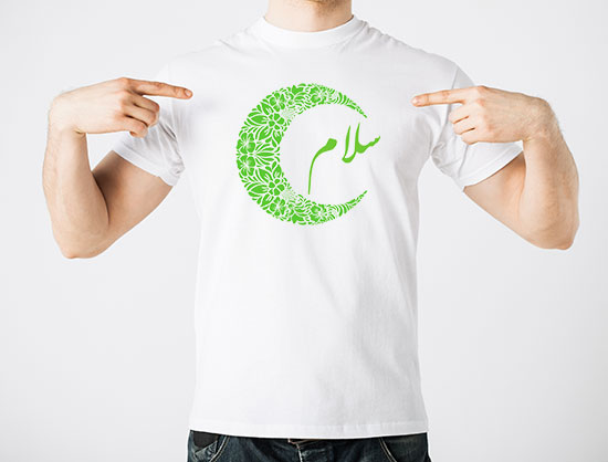 T-Shirt moderne avec illustration représentant un croissant et une calligraphie du mot "Salam" (سلام).