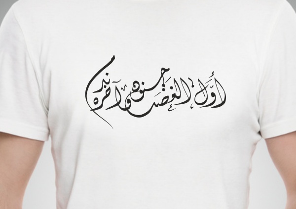T-Shirt avec très jolie calligraphie artistique de l'expression arabe qui signifie : le début de la colère est folie et sa fin est amertume et regrets, dont voici l'énoncé en arabe :