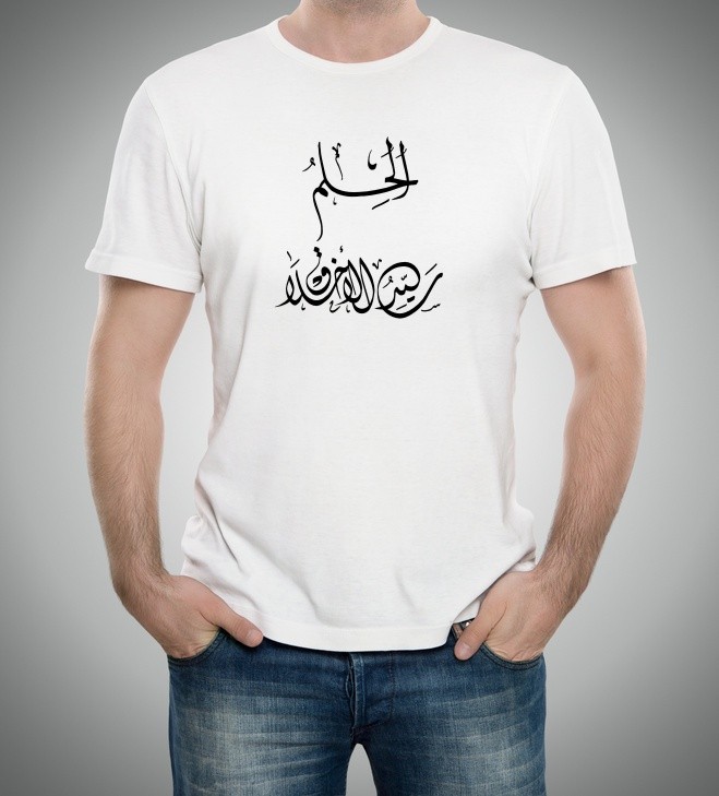 T-Shirt avec très jolie calligraphie artistique de l'expression arabe "La douceur est la meilleure des qualités" الحِلْمُ سَيِّدُ الأَخْلاَق.