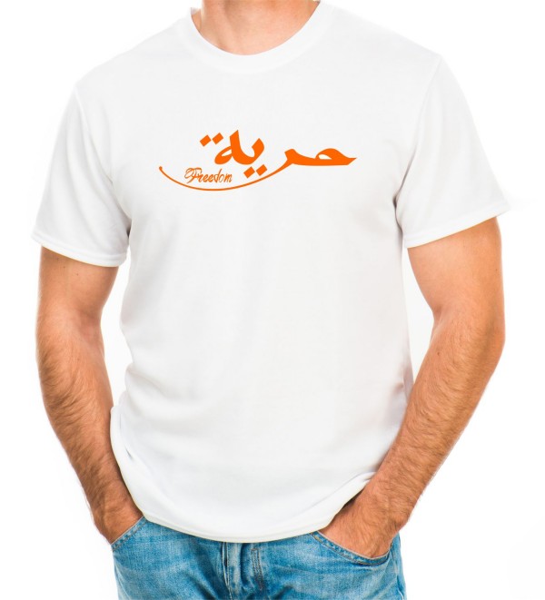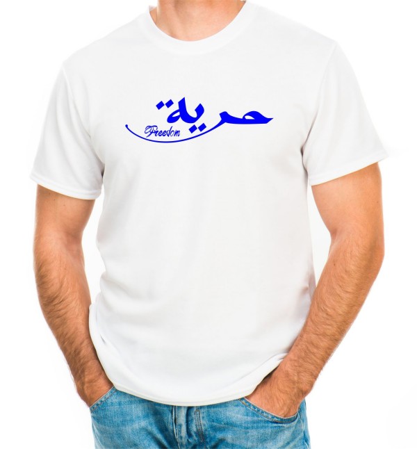 T-Shirt personnalisé avec calligraphie "Liberté" en arabe (Houriyya حرية) et en anglais (Freedom) et message optionnel (plusieurs couleurs disponibles) - REF. 32984 (14.90 €)