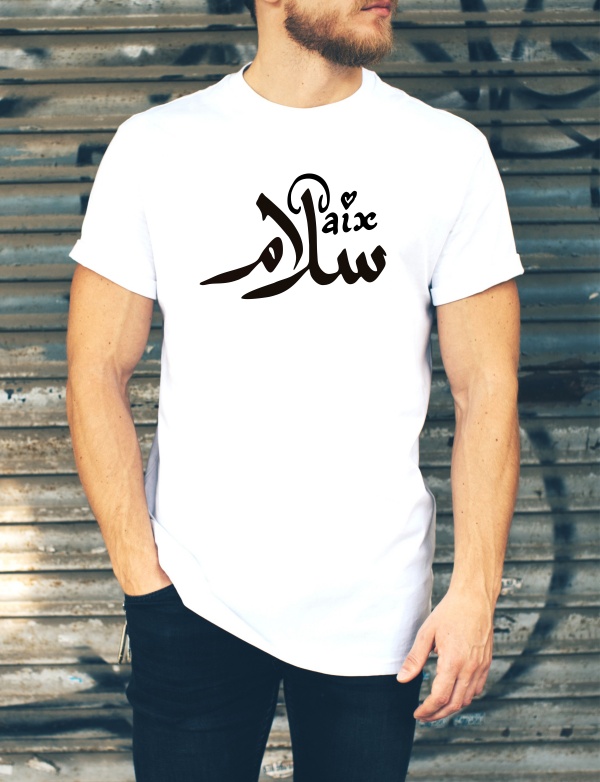 T-Shirt avec calligraphie arabe du mot "سلام" (Paix) et écriture en français également.