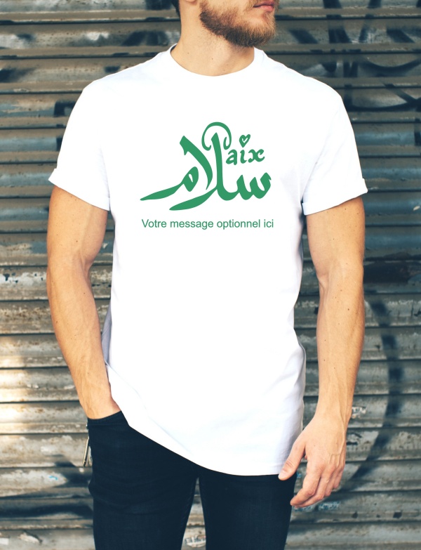 T-Shirt personnalisé avec calligraphie Paix "Salâm" en arabe (سلام) et message optionnel (plusieurs couleurs disponibles) - REF. 32991 (14.90 €)