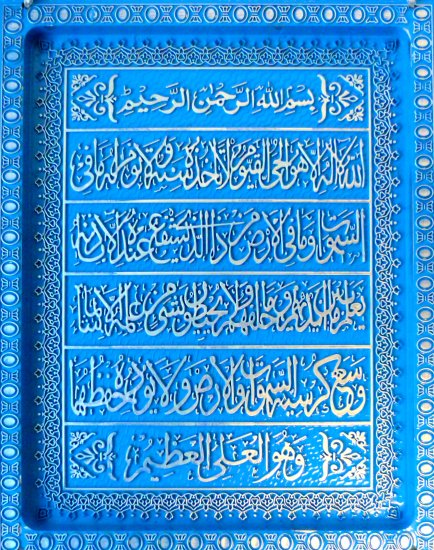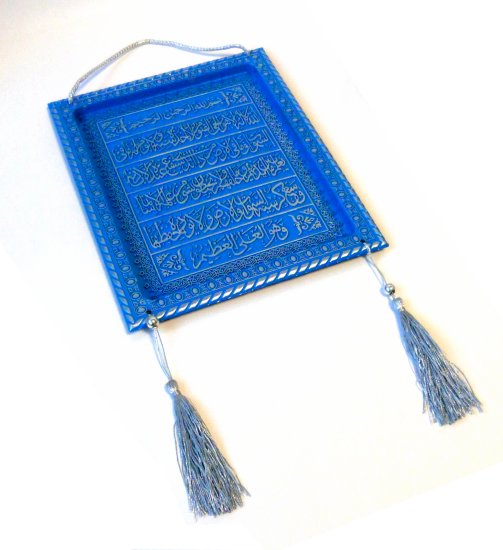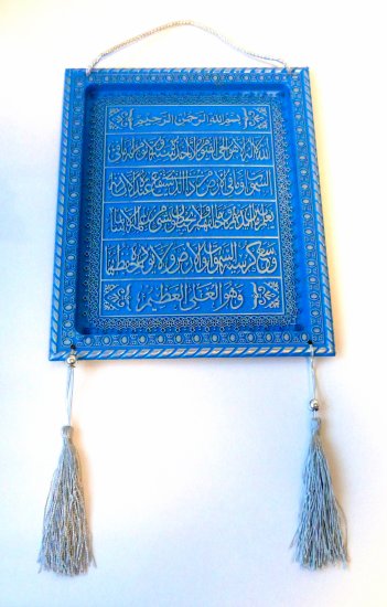 Tableau-Fanion en plastique de couleur bleue avec "Ayatoul-Koursî" (Le Verset du Trône) complet.