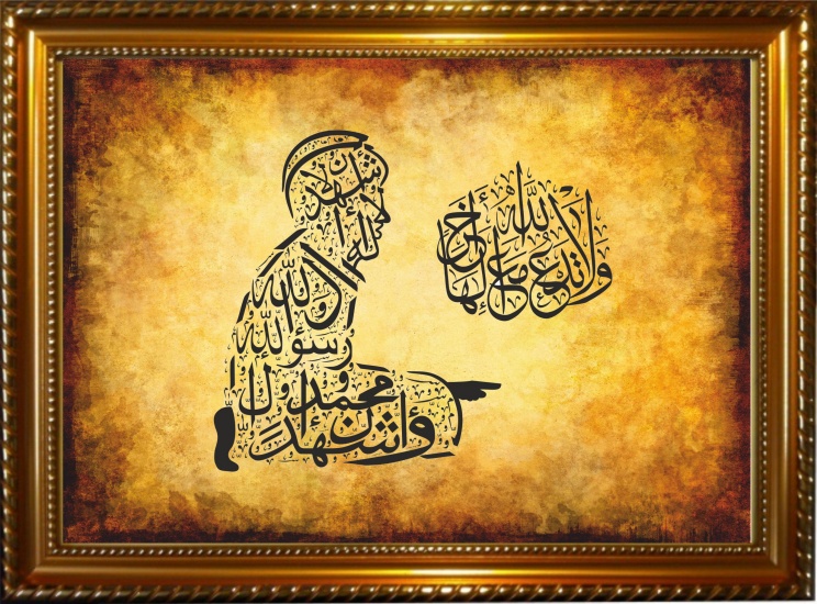 Tableau avec la calligraphie artistique de l'attestation de foi sous forme d'une personne qui fait la prière... ainsi que du verset coranique "وَلَا تَدْعُ مَعَ اللَّهِ إِلَٰهًا آخَرَ" - "Et n'adore point d'autre divinité en dehors d'Allah !"
