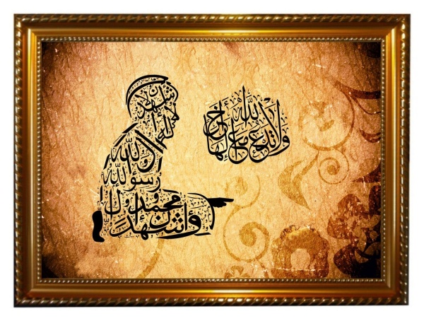 Tableau avec la calligraphie artistique de l'attestation de foi sous forme d'une personne qui fait la prière... ainsi que du verset coranique "وَلَا تَدْعُ مَعَ اللَّهِ إِلَٰهًا آخَرَ" - "Et n'adore point d'autre divinité en dehors d'Allah !"