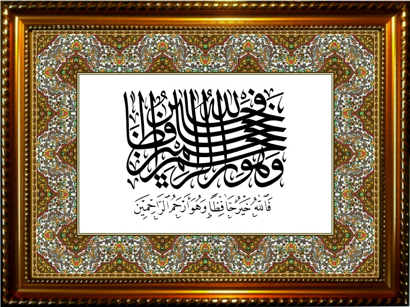 Tableau calligraphique du verset coranique : Allah est le meilleur gardien, et Il est Le plus Misericordieux des misericordieux