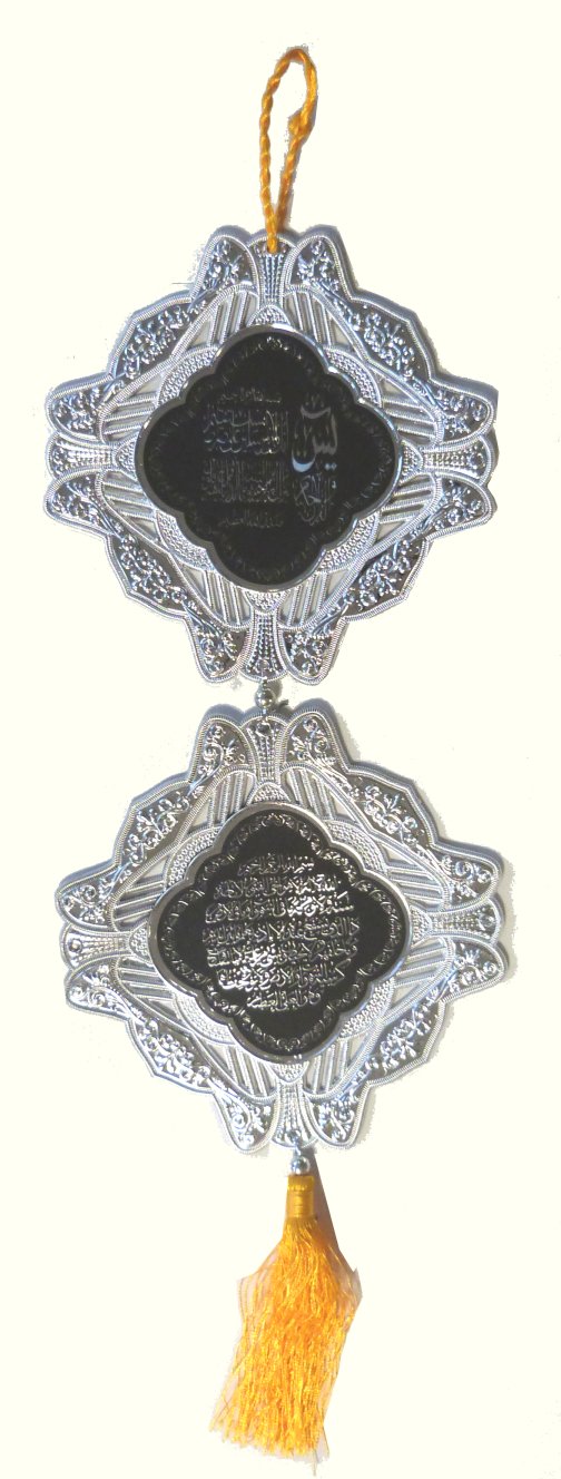 Décoration islamique argentée avec pompon en 3 parties contenant des inscriptions islamiques en arabe (Sourates, verset du Trône...) - REF. 20294 (7.50 €)