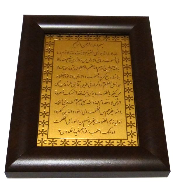 Tableau/cadre décoratif, bordures en bois marron, au fond doré, portant la calligraphie du verset du Trône (Âyat-ul-Koursî).