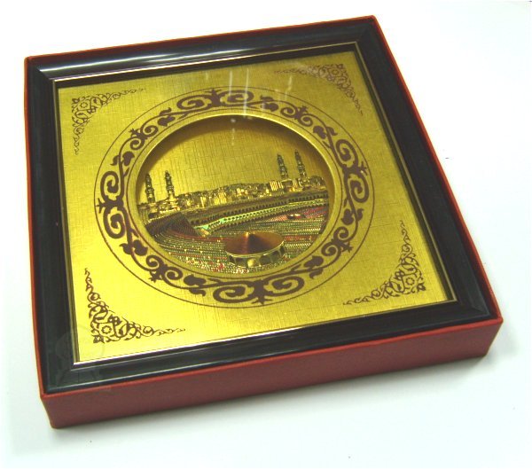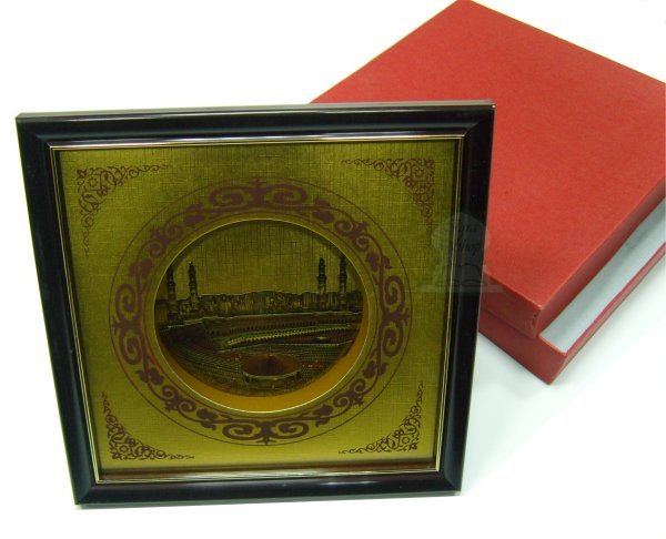 Tableau doré avec la représentation des La Mosquée Sainte de La Mecque, ainsi que la Kâba. Fourni avec sa boite cadeau rouge.