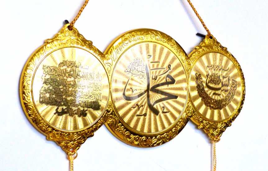 Décoration murale dorée avec trois parties contenant l'Attestation de foi, Le Nom de prophète Muhammad (SAW) et Sourate Yassin - REF. 23997 (3.90 €)